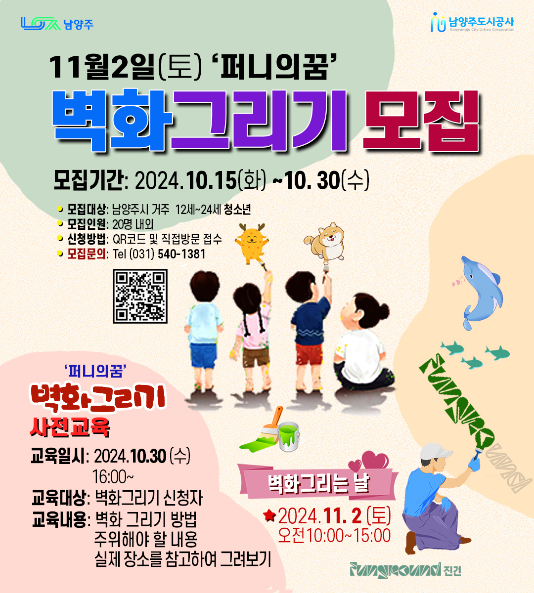 공지 청소년자치위원회 [펀그라운드 진건] 퍼니의꿈 '벽화그리기' 모집 안내 작성자 펀그라운드진건 등록일자 2024년 10월 15일 19시 43분 0초 조회 203 벽화그리기.jpg [ Size : 1.08MB, Down : 77 ] 미리보기 다운로드 목록보기