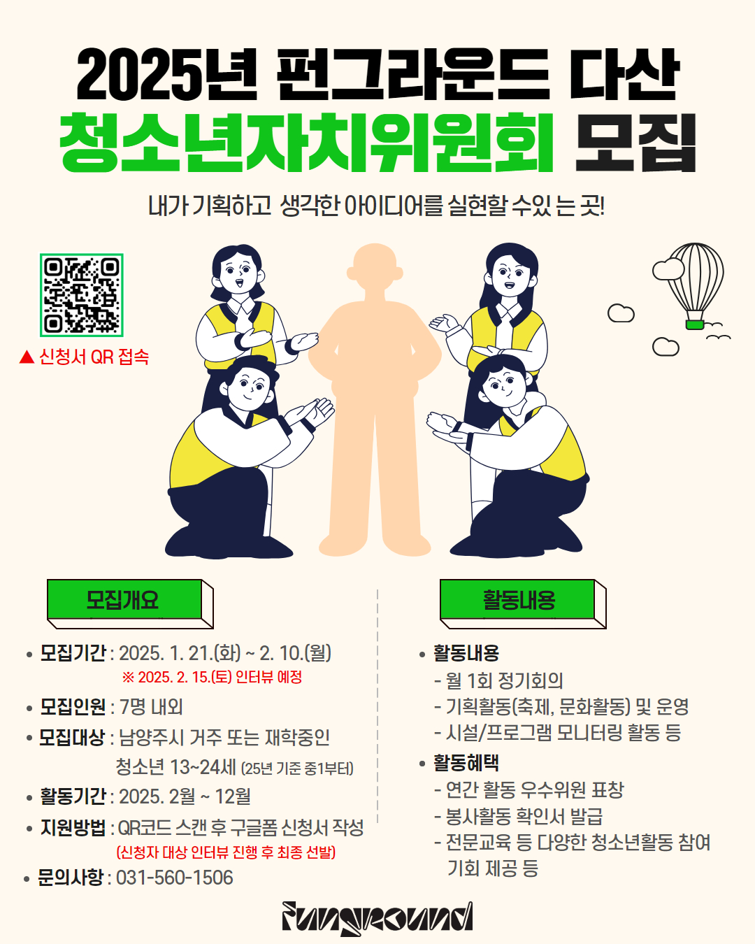 다산 [펀그라운드 다산] 2025년 청소년자치위원회 모집 안내 작성자 펀그라운드다산 등록일자 2025년 1월 21일 14시 25분 3초 조회 390 구글 폼 링크https://docs.google.com/forms/d/e/1FAIpQLSfTi1MqbXLH1j7SGxW2zBr3Q1bzEpQA9ubrCXBZ63Stkd0z7Q/viewform?usp=sf_link KakaoTalk_20250123_100356184.jpg [ Size : 735.23KB, Down : 225 ] 미리보기 다운로드 목록보기