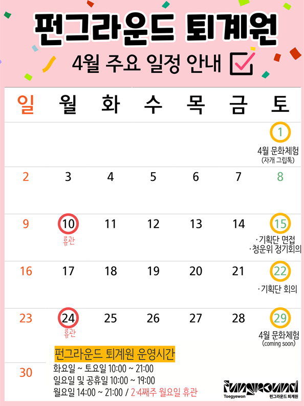 퇴계원 펀그라운드 퇴계원 4월 일정 작성자 펀그라운드 퇴계원 등록일자 2023년 4월 12일 16시 51분 37초 조회 481 펀그라운드 퇴계원의 4월 주요일정을 안내드립니다! 4/1(토)문화체험(자개공예)4/15(토)청소년기획단 면접, 청소년운영위원회 4월 정기회의4/22(토)청소년기획단 4월 정기회의4/29(토)문화체험(Coming soon) ※10일, 24일은 휴관입니다.※ 프로그램들의 자세한 내용은 펀그라운드 홈페이지, 인스타그램,페이스북, 네이버 블로그를 참고해주세요~문의)031-560-1382~3 1.png [ Size : 134.24KB, Down : 270 ] 미리보기 다운로드 목록보기