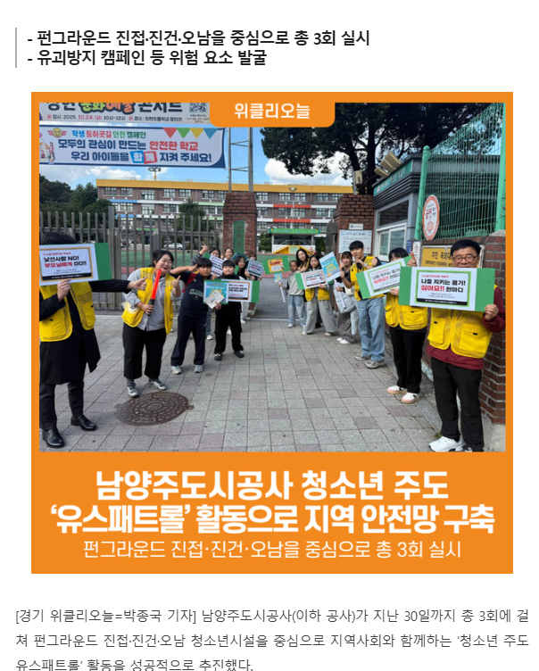 오남 (2025.10.) 남양주도시공사, 청소년 주도 ‘유스패트롤’ 활동으로 지역 안전망 구축 작성자 펀그라운드오남 등록일자 2025년 11월 15일 10시 25분 29초 조회 6 [위클리오늘] 남양주도시공사, 청소년 주도 ‘유스패트롤’ 활동으로 지역 안전망 구축 < 경기 < 전국지사 < 기사본문 - 위클리오늘 스크린샷 2025-11-15 102743.png [ Size : 594.33KB, Down : 8 ] 미리보기 다운로드 목록보기