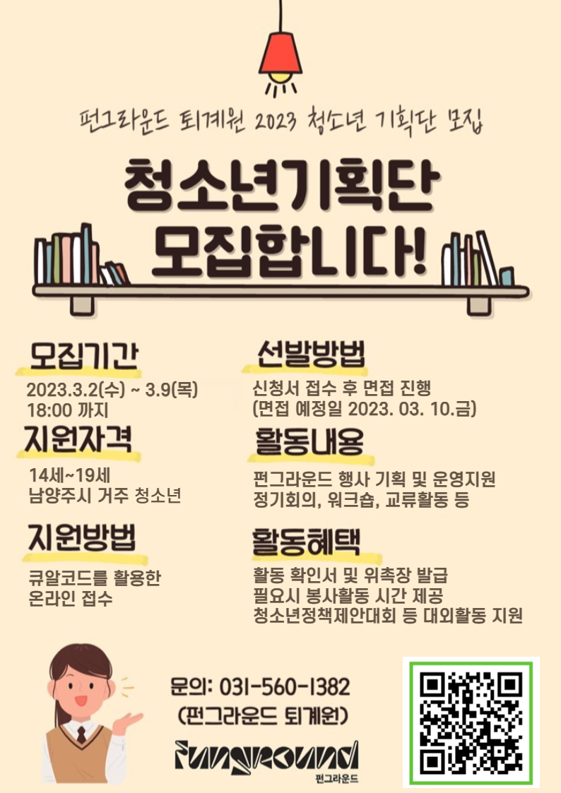 퇴계원 펀그라운드 퇴계원 기획단 모집기간 연장 안내 작성자 펀그라운드 퇴계원 등록일자 2023년 3월 2일 16시 50분 26초 조회 380 펀그라운드 퇴계원 2023년 기획단 모집 포스터.jpg [ Size : 420.99KB, Down : 228 ] 미리보기 다운로드 목록보기