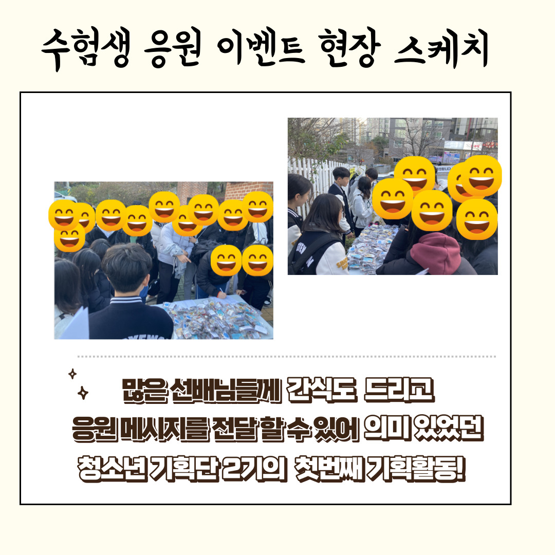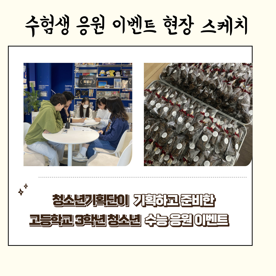 퇴계원 청소년 기획단 기획활동 '고3 수능 응원 이벤트' 현장스케치! 작성자 펀그라운드 퇴계원 등록일자 2023년 11월 16일 17시 19분 7초 조회 268 기획단 1.jpg [ Size : 133.53KB, Down : 178 ] 미리보기 다운로드 기획단 2.jpg [ Size : 261.8KB, Down : 157 ] 미리보기 다운로드 기획단 3.jpg [ Size : 294.09KB, Down : 172 ] 미리보기 다운로드 기획단 4.jpg [ Size : 264.32KB, Down : 156 ] 미리보기 다운로드 기획단 5.jpg [ Size : 220.48KB, Down : 164 ] 미리보기 다운로드 목록보기
