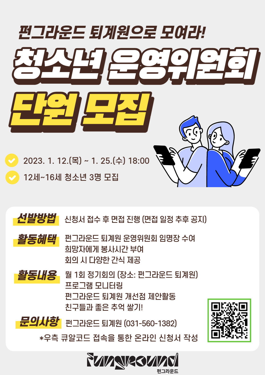 퇴계원 펀그라운드 퇴계원 청소년 운영위원회 모집안내 작성자 펀그라운드 퇴계원 등록일자 2023년 1월 13일 16시 58분 10초 조회 343 청소년운영위원회.jpg [ Size : 707.94KB, Down : 205 ] 미리보기 다운로드 목록보기