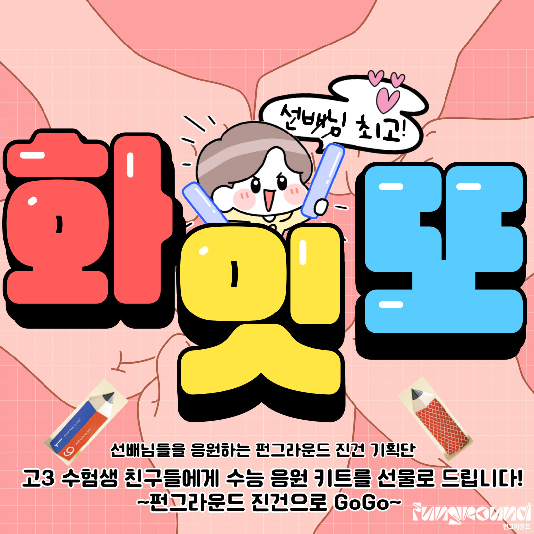 진건 [펀그라운드 진건] 11월 16일 수능 응원 이벤트 <응원 키트> 작성자 펀그라운드진건 등록일자 2023년 11월 16일 14시 49분 8초 조회 259 펀그라운드 진건에서 고3 수험생들을 응원하고 있습니다!고3 수험생들은 펀그라운드 진건으로 오셔서 응원키트를 받아가시면 됩니다!귀여운 연필 응원키트에 달콤한 간식도 덤으로 받아가세요! >_<수능 파이팅-! 언제나 응원합니다-! 제목을-입력해주세요_-001 (11).jpg [ Size : 270.5KB, Down : 122 ] 미리보기 다운로드 목록보기