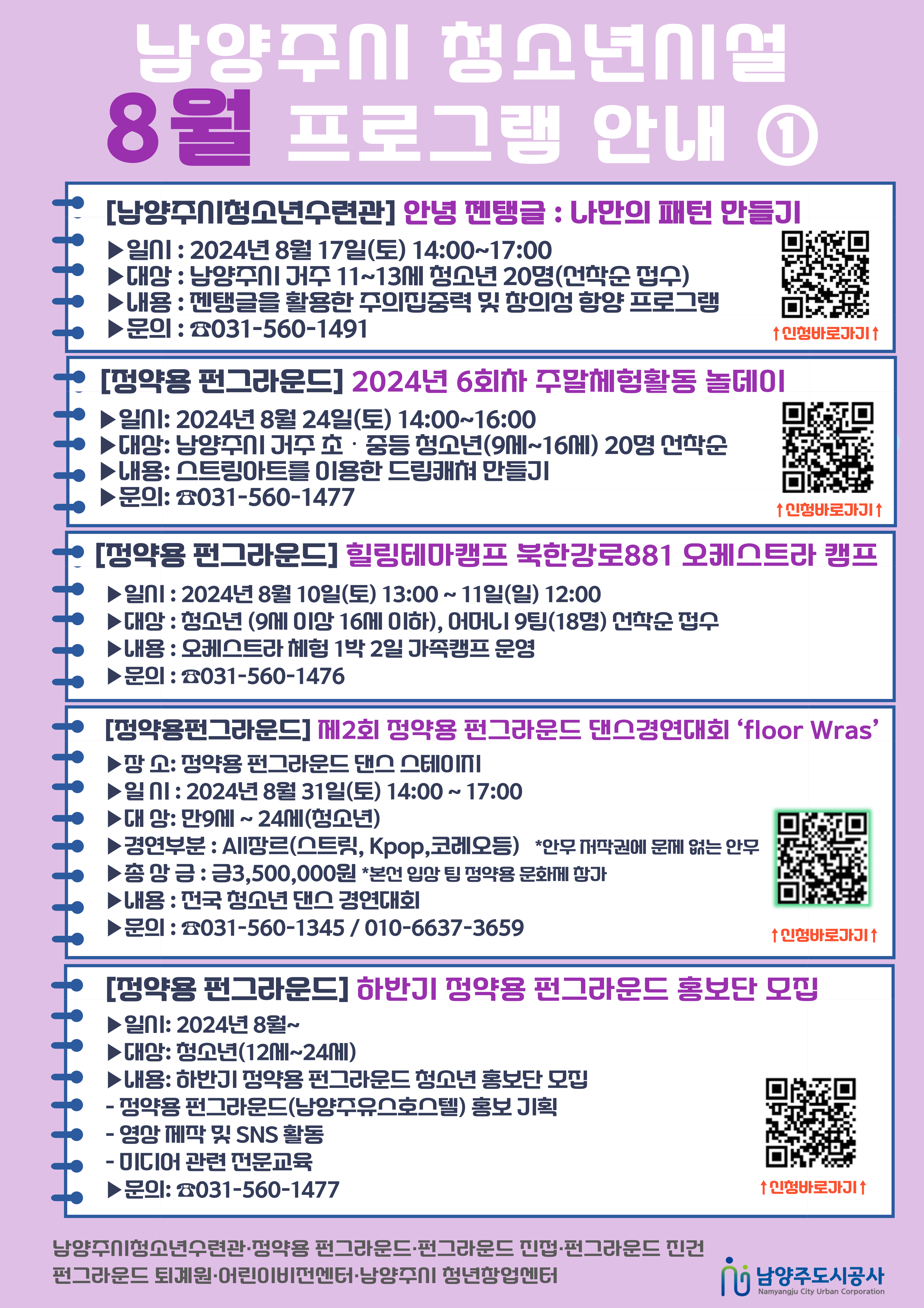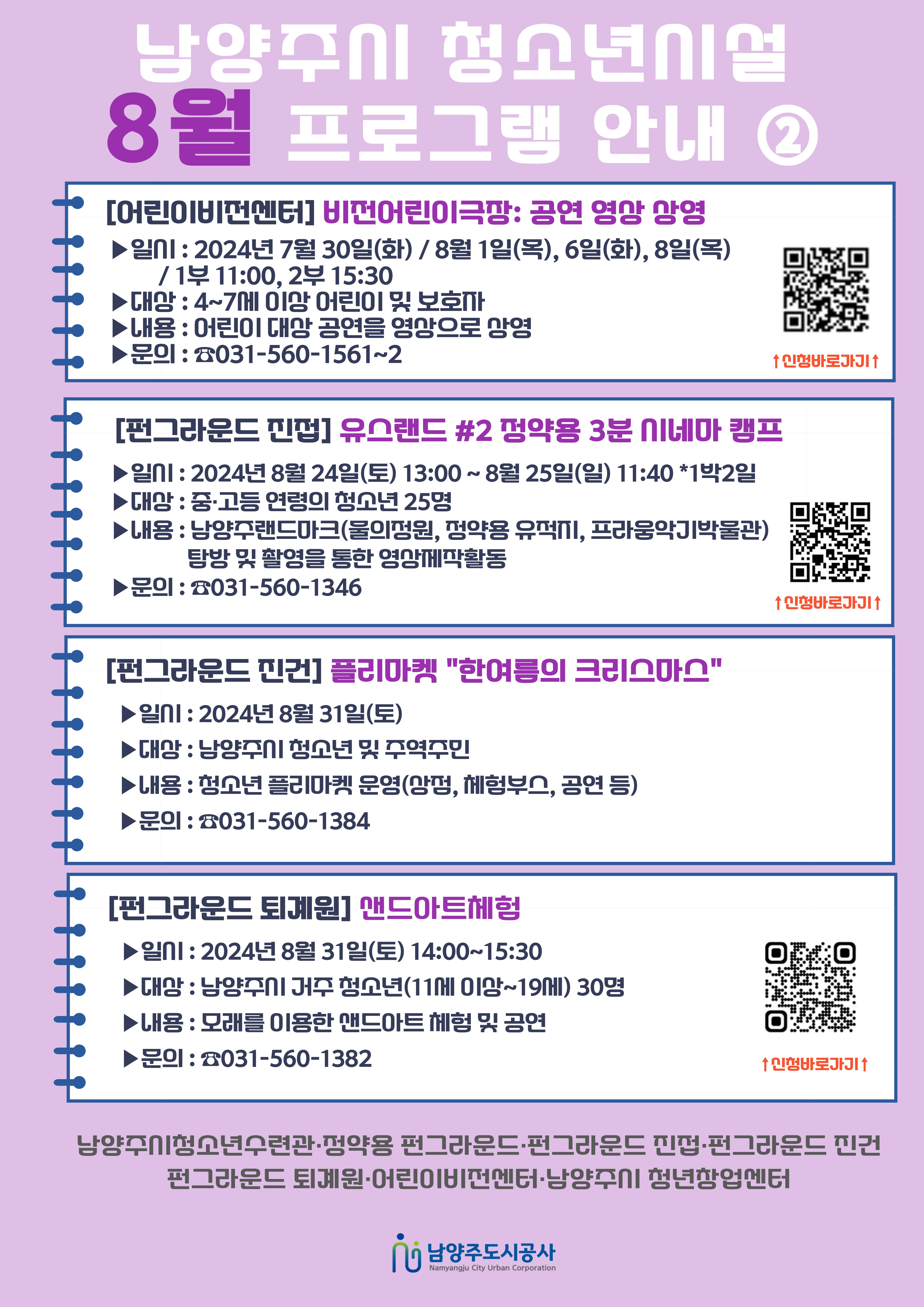 공통 [공지] 남양주시 청소년시설 8월 프로그램 안내 작성자 펀그라운드진접 등록일자 2024년 8월 1일 17시 30분 26초 조회 106 남양주시 청소년시설 8월 연합홍보지(1).png [ Size : 1.99MB, Down : 68 ] 미리보기 다운로드 남양주시 청소년시설 8월 연합홍보지(2).png [ Size : 1.7MB, Down : 87 ] 미리보기 다운로드 목록보기