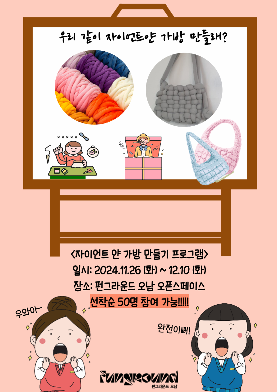 오남 [펀그라운드 오남] 자이언트얀 가방 만들기 프로그램 안내 작성자 개발자 등록일자 2024년 11월 21일 14시 15분 32초 조회 211 펀그라운드 오남에서 자이언트얀 가방 만들기를 합니다!!일시:2024.11.26(화)~12.10(화)/ 운영시간 내 상시적으로 진행장소: 펀그라운드 오남 오픈스페이스많은 관심과 참여부탁드립니다~~~~ 우리 함께 예쁜 가방 만들어보자구요!! 자이언트얀 가방만들기 일반용.png [ Size : 428.48KB, Down : 209 ] 미리보기 다운로드 목록보기