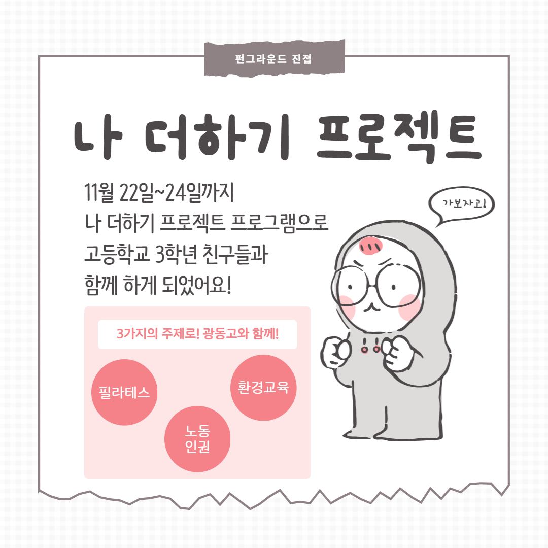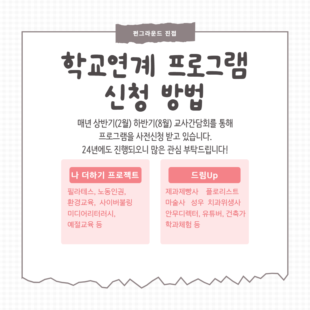 진접 광동고와 함께하는 11월 학교연계 프로그램 안내 작성자 펀그라운드진접 등록일자 2023년 11월 16일 12시 0분 6초 조회 285 안녕하세요 펀그라운드 진접 입니다!11월에는 광동고등학교와 함께 학교연계 프로그램이 진행됩니다. 많은 관심 부탁드리며 24년도에는 교사간담회를 통해 사전접수를 진행합니다! 11월학교연계안내 1.png [ Size : 204.96KB, Down : 128 ] 미리보기 다운로드 11월학교연계안내 2.png [ Size : 159.56KB, Down : 131 ] 미리보기 다운로드 11월학교연계안내 3.png [ Size : 132.09KB, Down : 127 ] 미리보기 다운로드 11월학교연계안내 4.png [ Size : 126.63KB, Down : 138 ] 미리보기 다운로드 목록보기