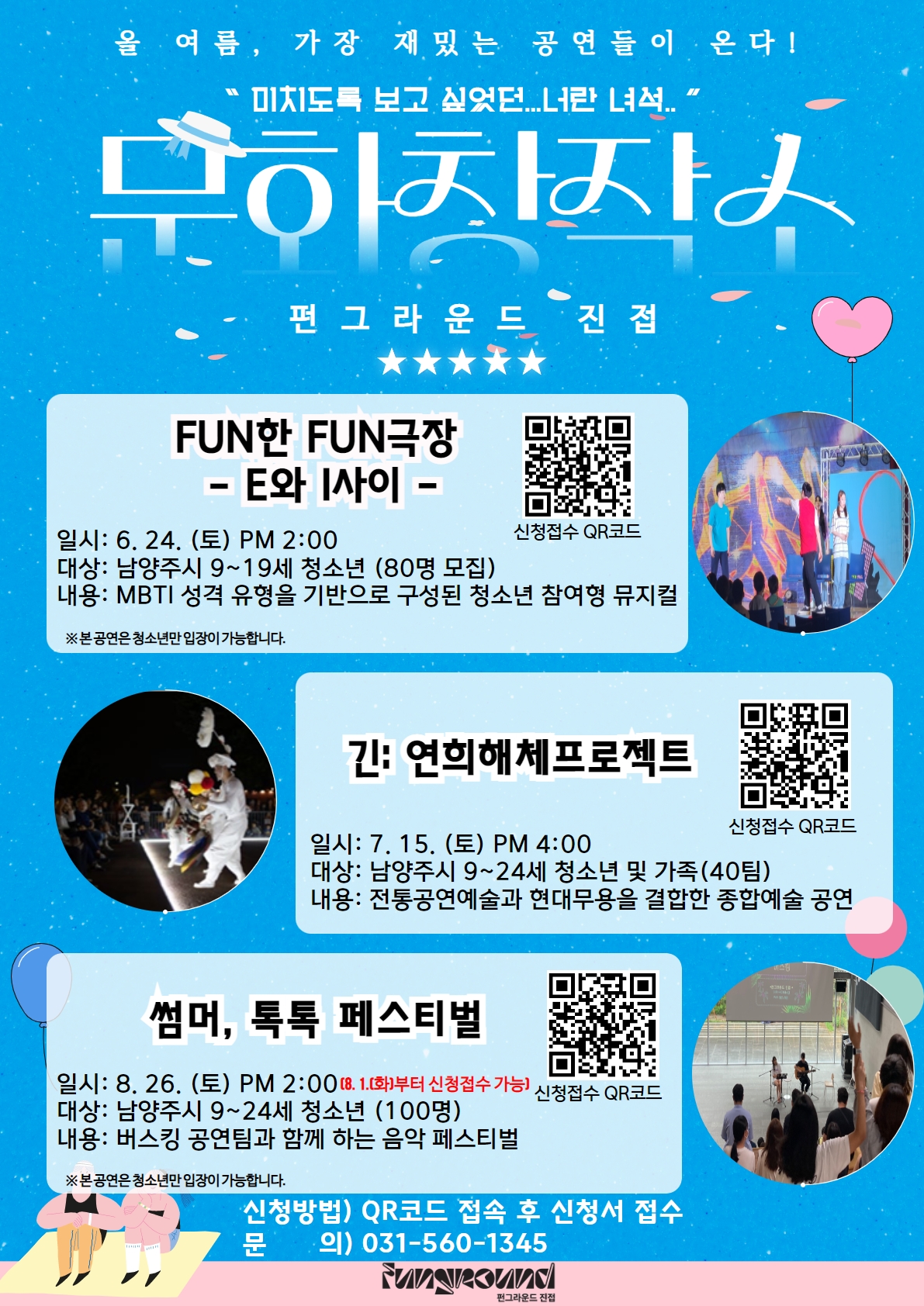 진접 8월 문화창작소 오픈(썸머, 톡톡 페스티벌) 작성자 펀그라운드진접 등록일자 2023년 7월 18일 16시 17분 57초 조회 317 문화창작소.jpg [ Size : 1.35MB, Down : 149 ] 미리보기 다운로드 목록보기