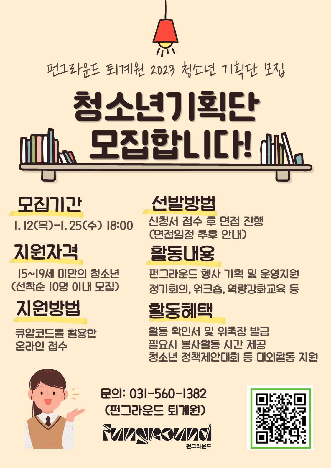퇴계원 펀그라운드 퇴계원 청소년기획단 모집안내 작성자 펀그라운드 퇴계원 등록일자 2023년 1월 13일 16시 56분 12초 조회 367 청소년기획단.jpg [ Size : 670.19KB, Down : 213 ] 미리보기 다운로드 목록보기