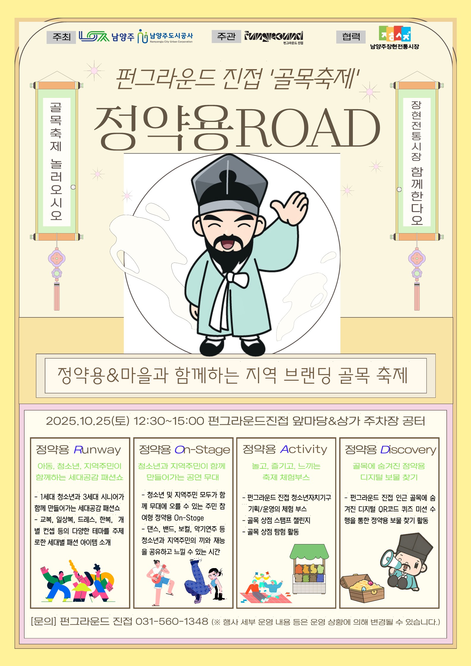 진접 [공지] 유스페스타 골목축제 '정약용ROAD' 작성자 펀그라운드진접 등록일자 2025년 10월 22일 13시 13분 21초 조회 87 골목축제_보도자료 포스터.jpg [ Size : 564.65KB, Down : 35 ] 미리보기 다운로드 목록보기