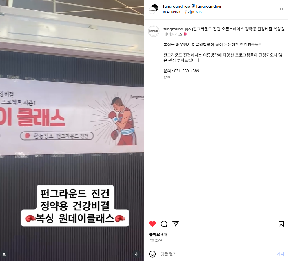 진건 [펀그라운드 진건] 오픈스페이스 '복싱 원데이 클래스' 작성자 펀그라운드진건 등록일자 2025년 10월 22일 17시 12분 1초 조회 45 스크린샷 2025-10-22 170829.png [ Size : 492.93KB, Down : 18 ] 미리보기 다운로드 목록보기