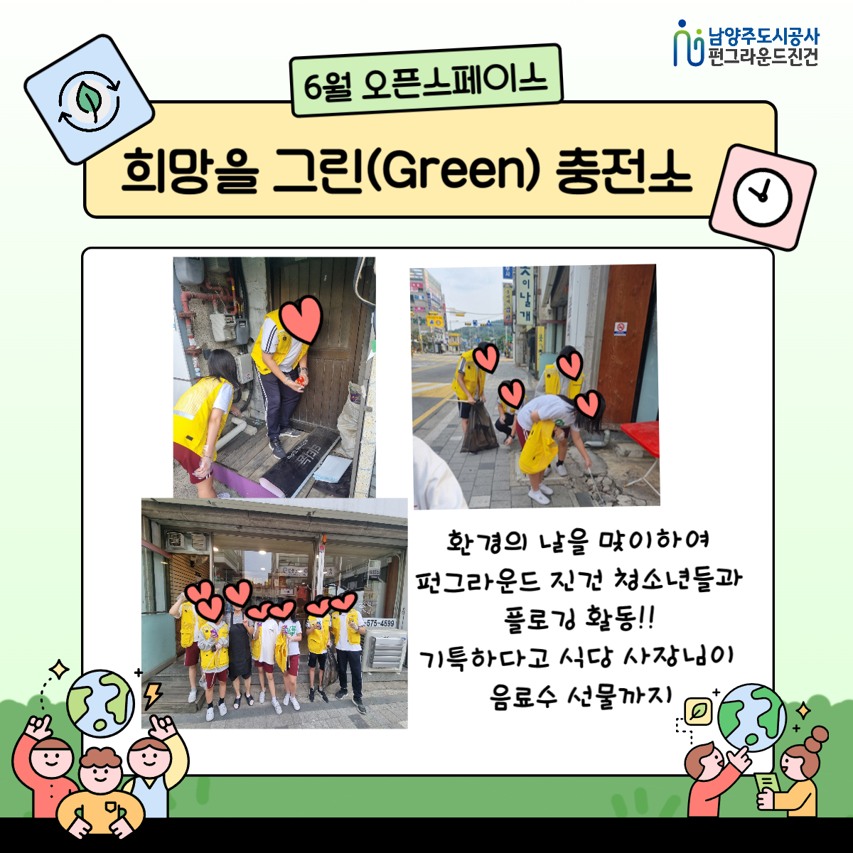 진건 6월 오픈스페이스 '희망을 그린(Green) 충전소' 활동 후기~!!! 작성자 개발자 등록일자 2024년 6월 5일 19시 31분 13초 조회 237 6월 오픈스페이스- 환경프로젝트~!!!환경의 날을 맞이하여 펀그라운드 진건 플로깅 활동!!!플로깅 활동 중 식당 사장님께서 기특하다고 음료수 선물 주셨다~!!!감사합니다 :) 6월 오픈스페이스.jpg [ Size : 901.4KB, Down : 81 ] 미리보기 다운로드 목록보기