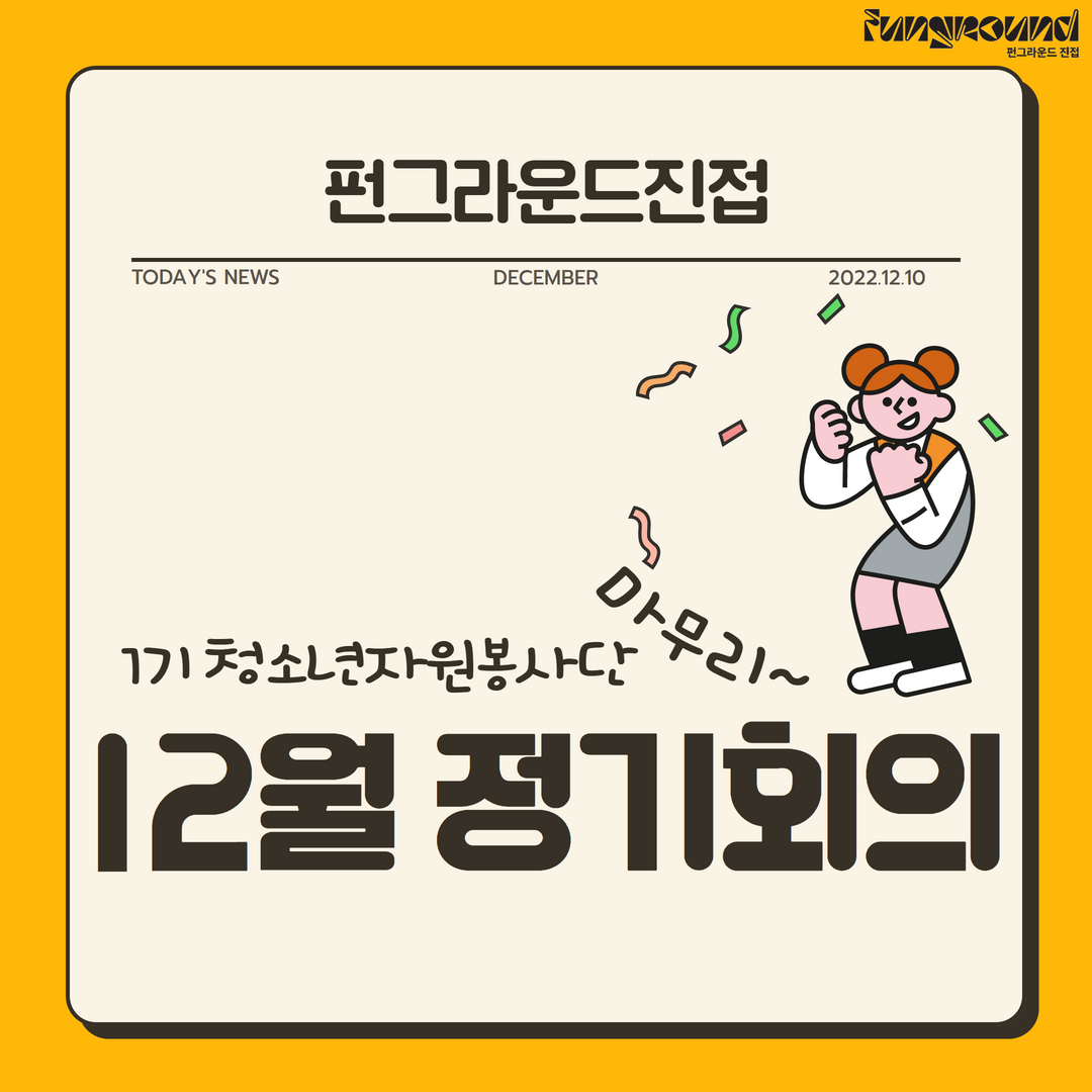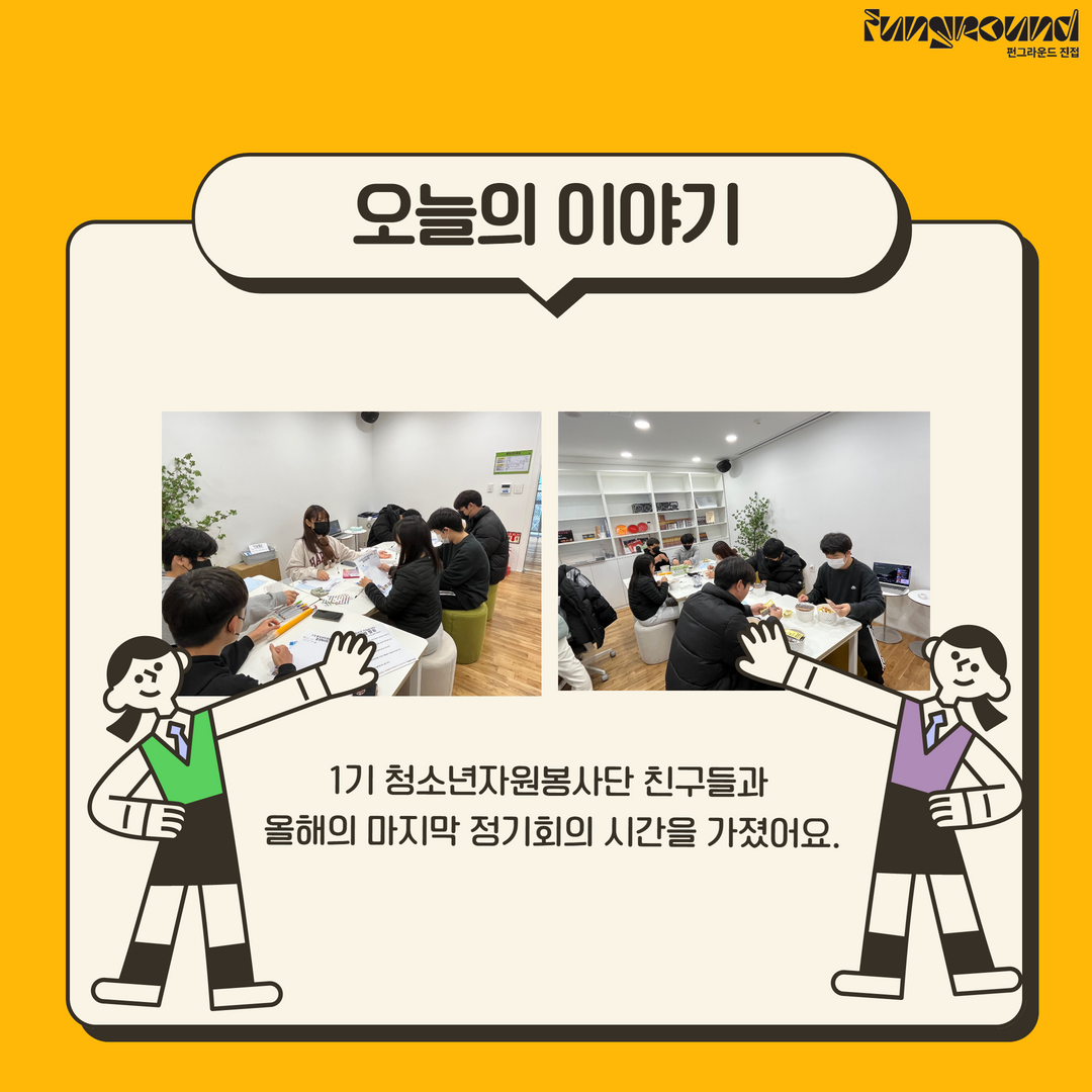 진접 [청소년자원봉사단] 12월 정기회의 작성자 펀그라운드진접 등록일자 2022년 12월 10일 20시 8분 50초 조회 509 안녕하세요 펀그라운드 진접입니다 :)펀그라운드진접의 자치기구인 청소년자원봉사단이 12월 정기회의를 진행하였는데요!1기로서의 마지막 정기회의 였어요~ㅠ_ㅠ그동안 함께한 친구들과 롤링페이퍼를 작성하고 미션을 수행하며 1기로서의 활동을 마무리하는 시간을 가졌습니다.카드뉴스로 자세한 소식 전해드립니다 ㅎ_ㅎ 진접)자봉단 정기회의결과 1.png [ Size : 214.18KB, Down : 158 ] 미리보기 다운로드 진접)자봉단 정기회의결과 2.png [ Size : 636.55KB, Down : 145 ] 미리보기 다운로드 진접)자봉단 정기회의결과 3.png [ Size : 1.2MB, Down : 144 ] 미리보기 다운로드 진접)자봉단 정기회의결과 4.png [ Size : 267.62KB, Down : 140 ] 미리보기 다운로드 목록보기