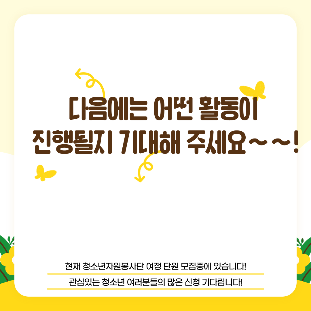 진접 [진접] 청소년자원봉사단 3월 정기회의 및 봉사활동 작성자 펀그라운드진접 등록일자 2025년 3월 15일 18시 15분 42초 조회 268 001 (6).png [ Size : 220.39KB, Down : 68 ] 미리보기 다운로드 002 (8).png [ Size : 535.72KB, Down : 80 ] 미리보기 다운로드 003 (9).png [ Size : 619KB, Down : 88 ] 미리보기 다운로드 004 (7).png [ Size : 112.6KB, Down : 79 ] 미리보기 다운로드 목록보기
