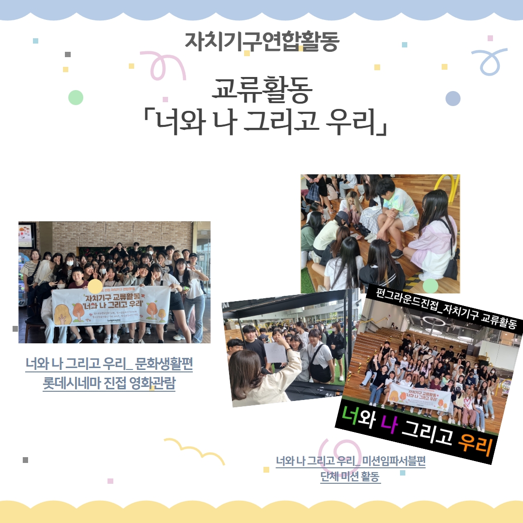 진접 [자치기구연합활동] '너와 나 그리고 우리' 교류 활동~!! 작성자 펀그라운드진접 등록일자 2023년 9월 20일 11시 6분 59초 조회 367 안녕하세요~!! 펀그라운드 진접 자치기구연합합동입니다. :)진접의 청소년자치기구 친구들과 함께 교류 활동을 진행했습니다.[문화생활편]과 [미션임파서블편]으로 나눠서 청소년 친구들에게 문화예술 감수성 UP UP!!!뿐만 아니라 협동심, 공동체 의식까지 UP UP UP!! 되는 시간이었습니다. 교류활동.jpg [ Size : 459.27KB, Down : 145 ] 미리보기 다운로드 목록보기