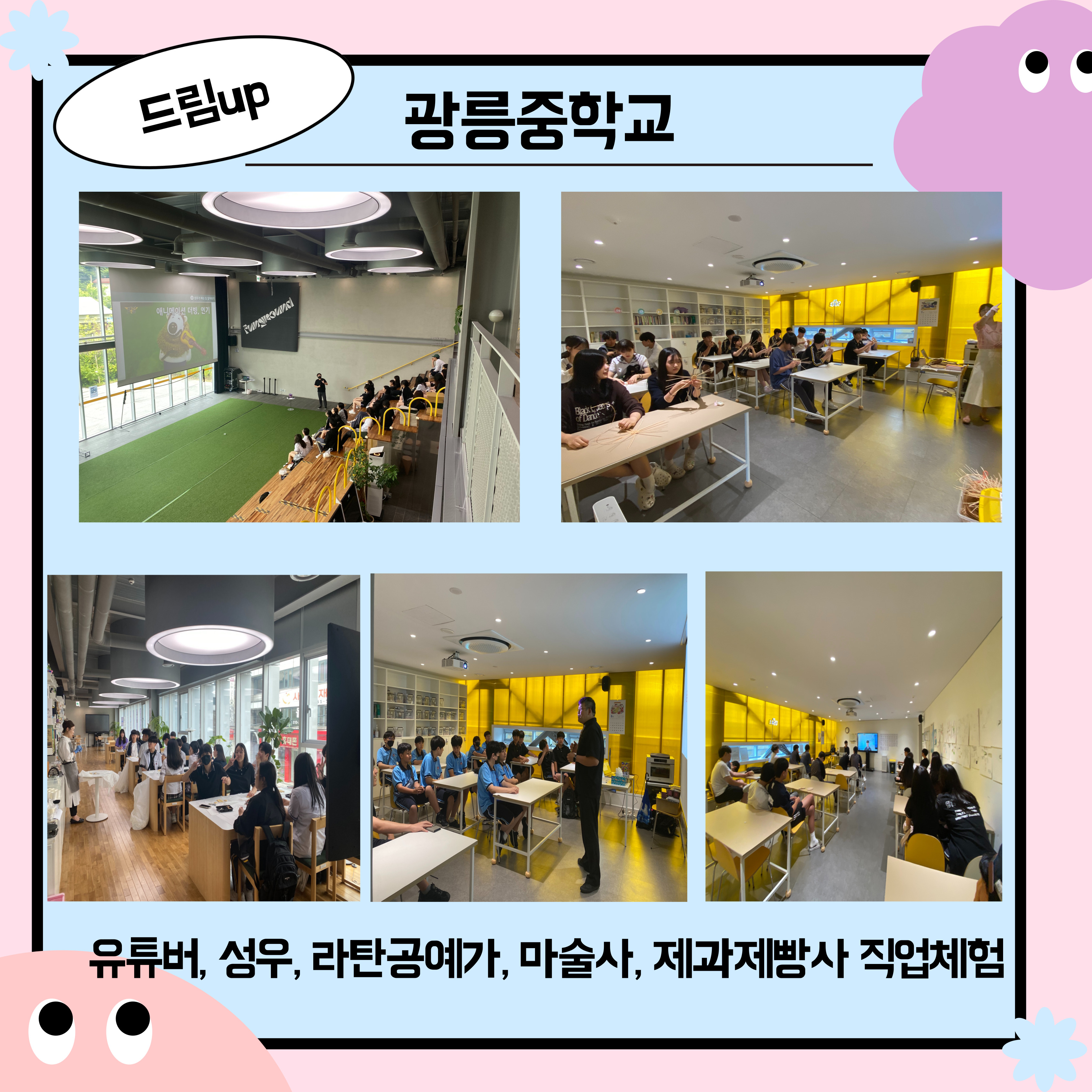 진접 [펀그라운드 진접] 7월 드림Up with 광릉중학교 작성자 펀그라운드진접 등록일자 2024년 7월 13일 17시 27분 57초 조회 299 7월 3일(수), 7월 9일(화)에 광릉중학교 친구들과 유튜버, 성우, 라탄공예가, 마술사, 제과제빵사 직업체험을 진행했습니다 앞으로의 드림UP 홣동도 많은 관심부탁드립니다~ 제목을-입력해주세요_-001 (1).jpg [ Size : 1.72MB, Down : 83 ] 미리보기 다운로드 목록보기