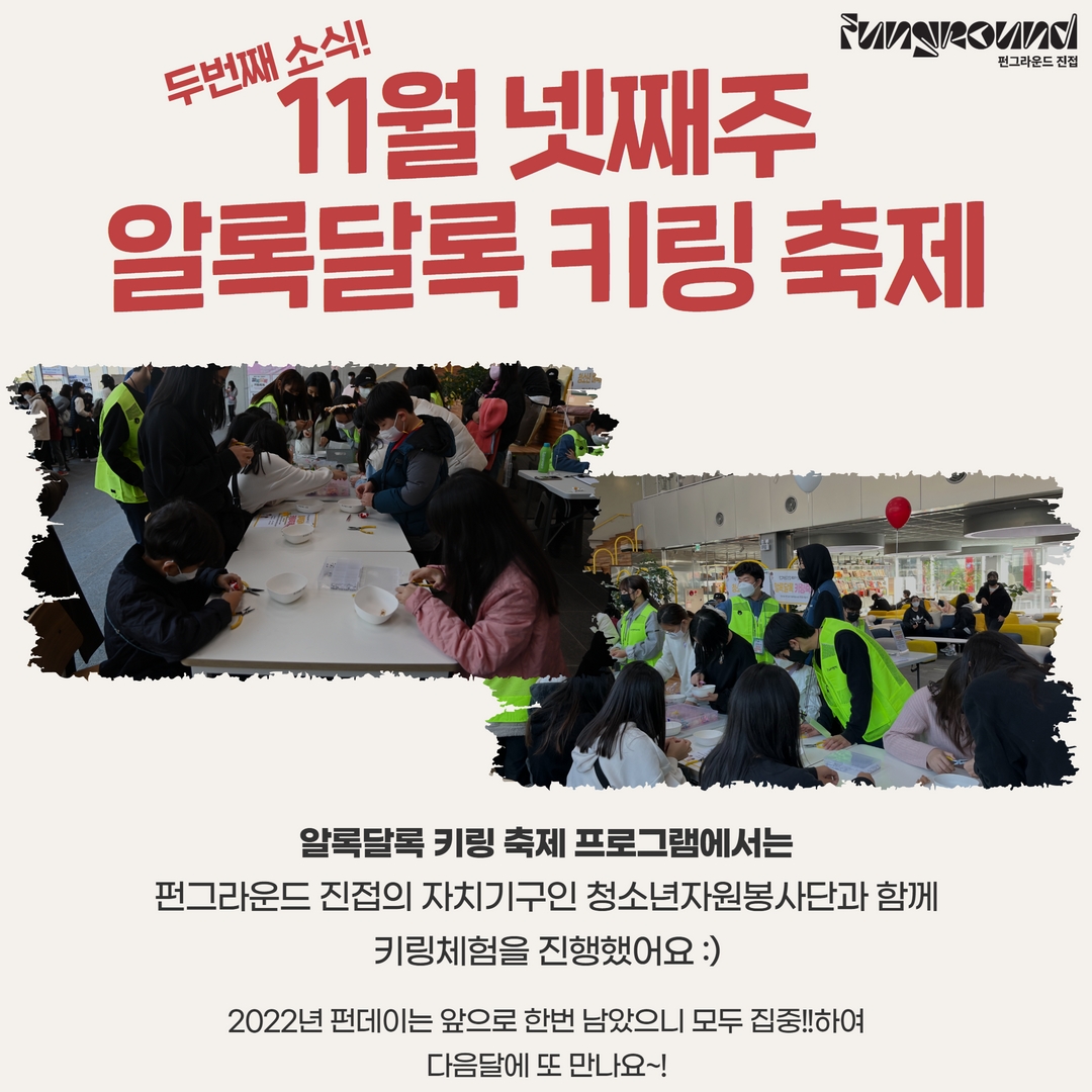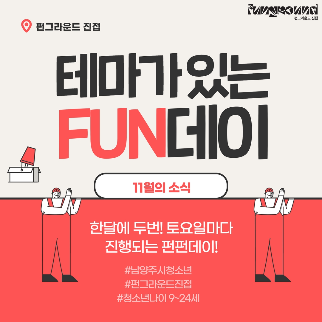 진접 [펀그라운드진접] 테마가 있는 FUN데이 11월 소식 작성자 펀그라운드진접 등록일자 2022년 11월 29일 17시 55분 45초 조회 415 안녕하세요 펀그라운드진접입니다.11월달 테마가 있는 FUN데이 소식을 들고 왔어요~!한달에 2번씩 펀그라운드 진접에서 토요일마다 진행되는 프로그램인데요!11월달에는 어떤 체험이 진행되었는지 카드뉴스로 소식을 접합니다 :) 11월 펀데이소식 1.jpg [ Size : 237.36KB, Down : 175 ] 미리보기 다운로드 11월 펀데이소식 2.jpg [ Size : 493.56KB, Down : 145 ] 미리보기 다운로드 11월 펀데이소식 3.jpg [ Size : 497.94KB, Down : 150 ] 미리보기 다운로드 11월 펀데이소식 4.jpg [ Size : 256.22KB, Down : 144 ] 미리보기 다운로드 목록보기