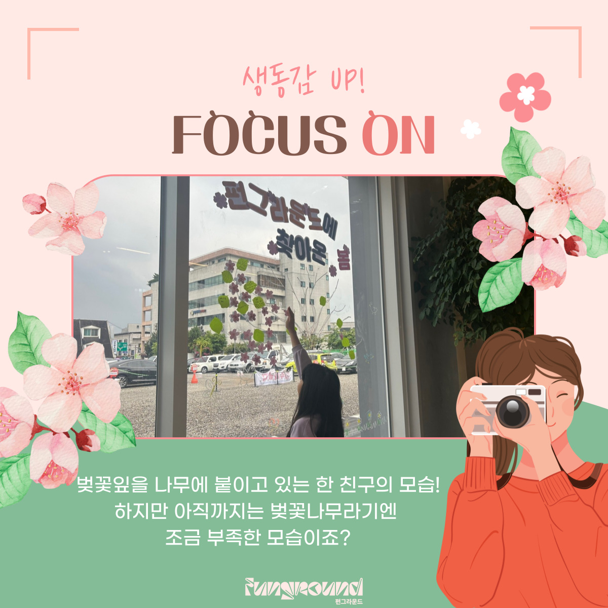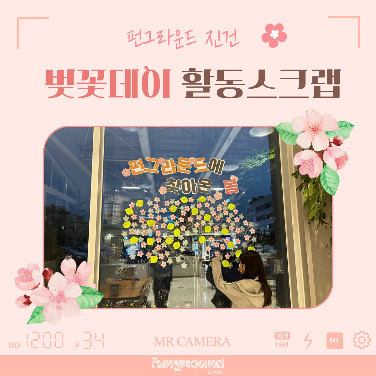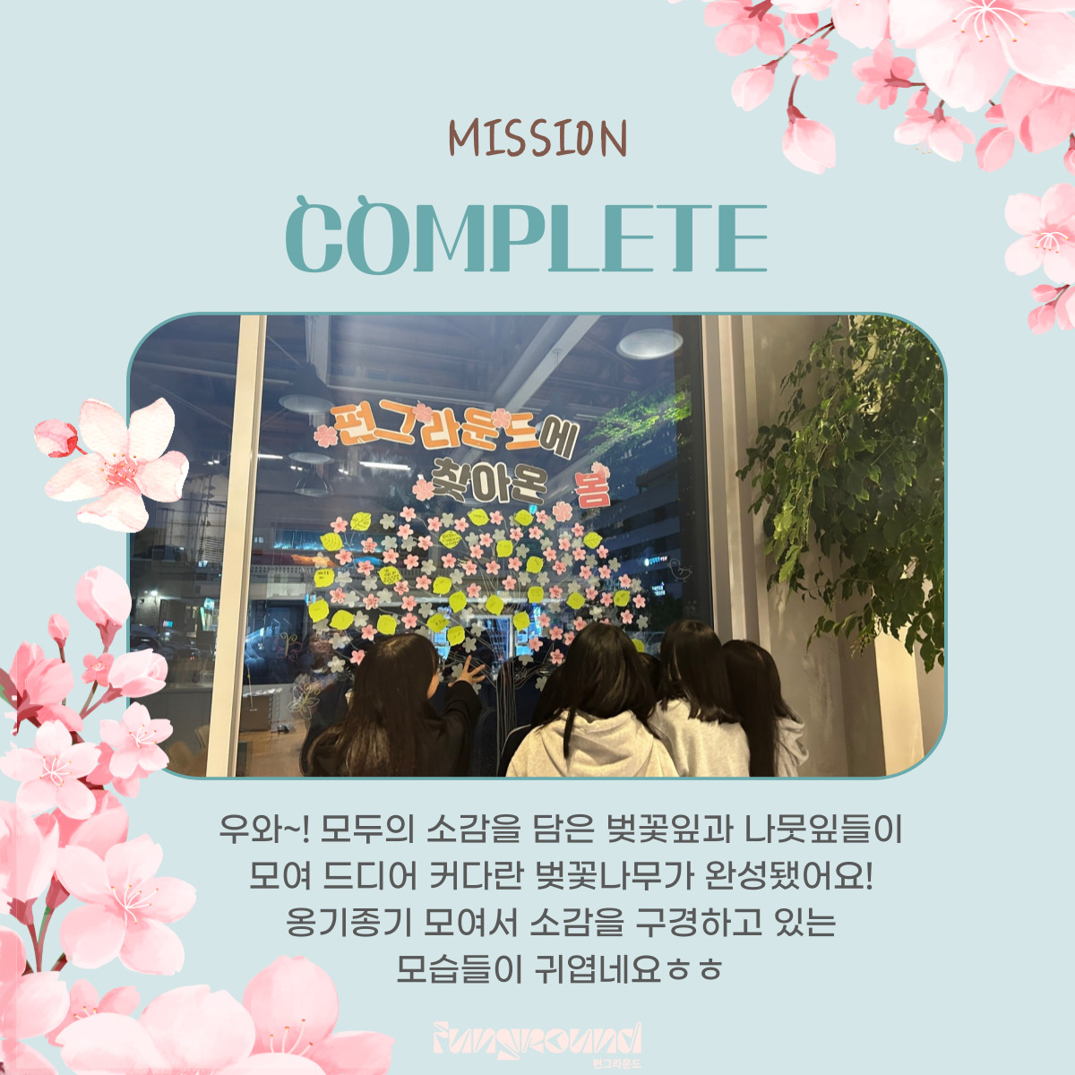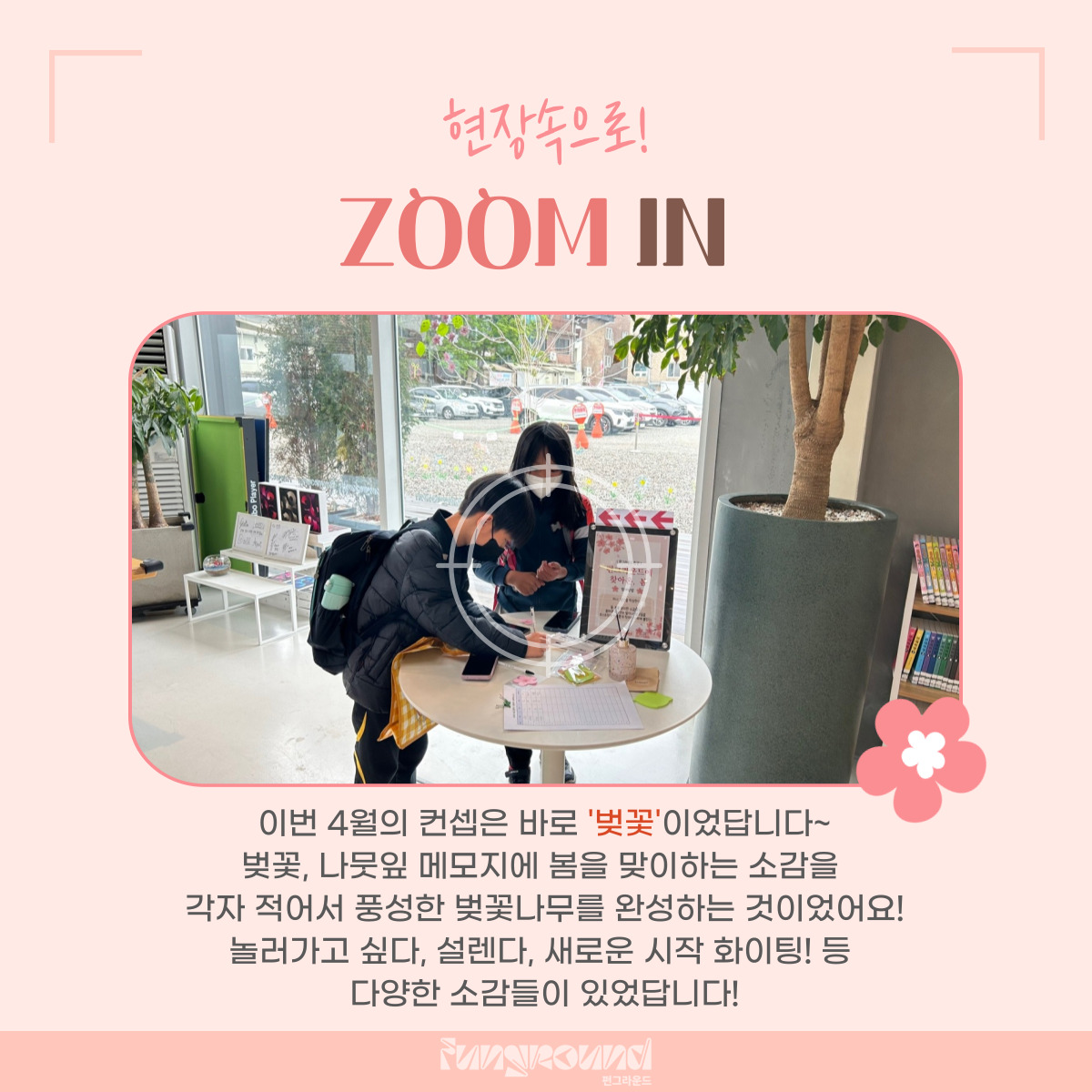 진건 [펀그라운드 진건] 4월 컨셉데이 '벚꽃데이' 활동스크랩 작성자 펀그라운드진건 등록일자 2023년 4월 25일 21시 26분 44초 조회 527 ❤️펀그라운드 진건❤️2023.4.25(화)오늘은 4월의 컨셉데이 벚꽃데이를 진행했습니다!봄을 맞이한 소감, 봄하면 떠오르는 생각들이 모이고 모여서커다랗고 울창한 벚꽃나무가 완성되었어요~다음 5월의 컨셉은 무엇일까요?기대해주세요! 001.jpg [ Size : 320.1KB, Down : 126 ] 미리보기 다운로드 002.jpg [ Size : 291.11KB, Down : 129 ] 미리보기 다운로드 003.jpg [ Size : 299.88KB, Down : 131 ] 미리보기 다운로드 004.jpg [ Size : 327.19KB, Down : 129 ] 미리보기 다운로드 005.jpg [ Size : 132.41KB, Down : 117 ] 미리보기 다운로드 목록보기