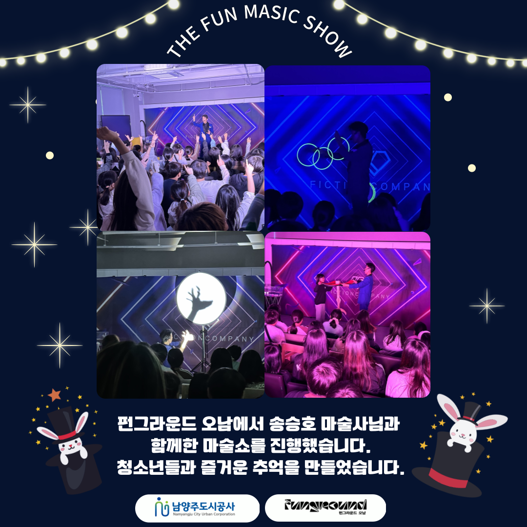 펀그라운드 오남에서 진행한 송승호 마술사님과 함께한 마술쇼를 청소년들의 열띤 참여와 호응으로 재밌게 마쳤습니다.