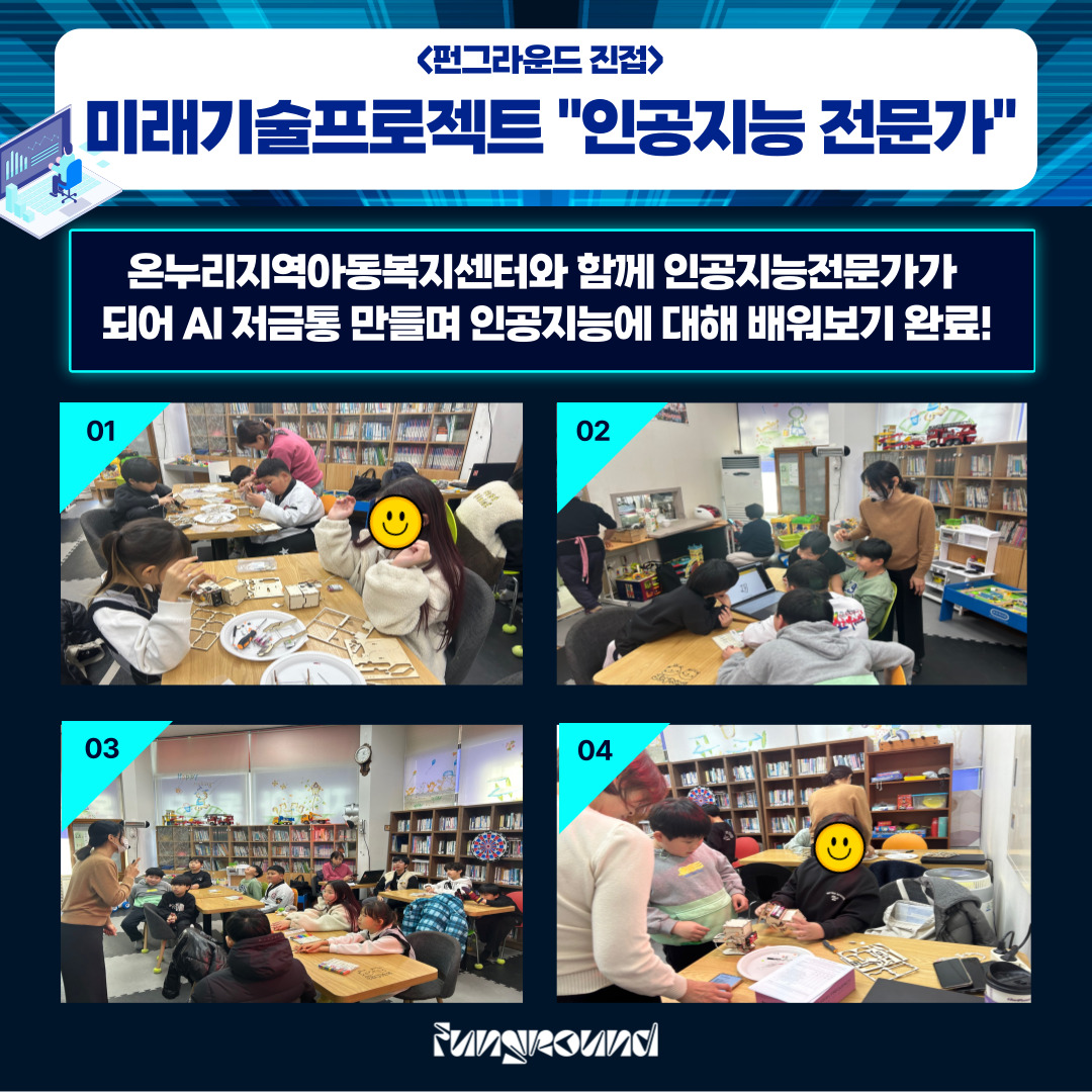 진접 [진접] 미래기술프로젝트 <인공지능 전문가> 작성자 펀그라운드진건 등록일자 2024년 12월 4일 18시 57분 45초 조회 282 온누리지역아동복지센터와 함께한 미래기술프로젝트인공지능 전문가가 되기 위해 인공지능에 대해 배워보고직접 AI 저금통을 만들어보는 시간을 가졌습니다.펀그라운드 진접에서는 청소년들이 미래기술을 접할 수 있는 기회를 제공하기위해다양한 프로그램을 진행하고 있습니다.많은 관심과 참여부탁드립니다~ 제목을-입력해주세요_-001 (2).jpg [ Size : 406.12KB, Down : 105 ] 미리보기 다운로드 목록보기