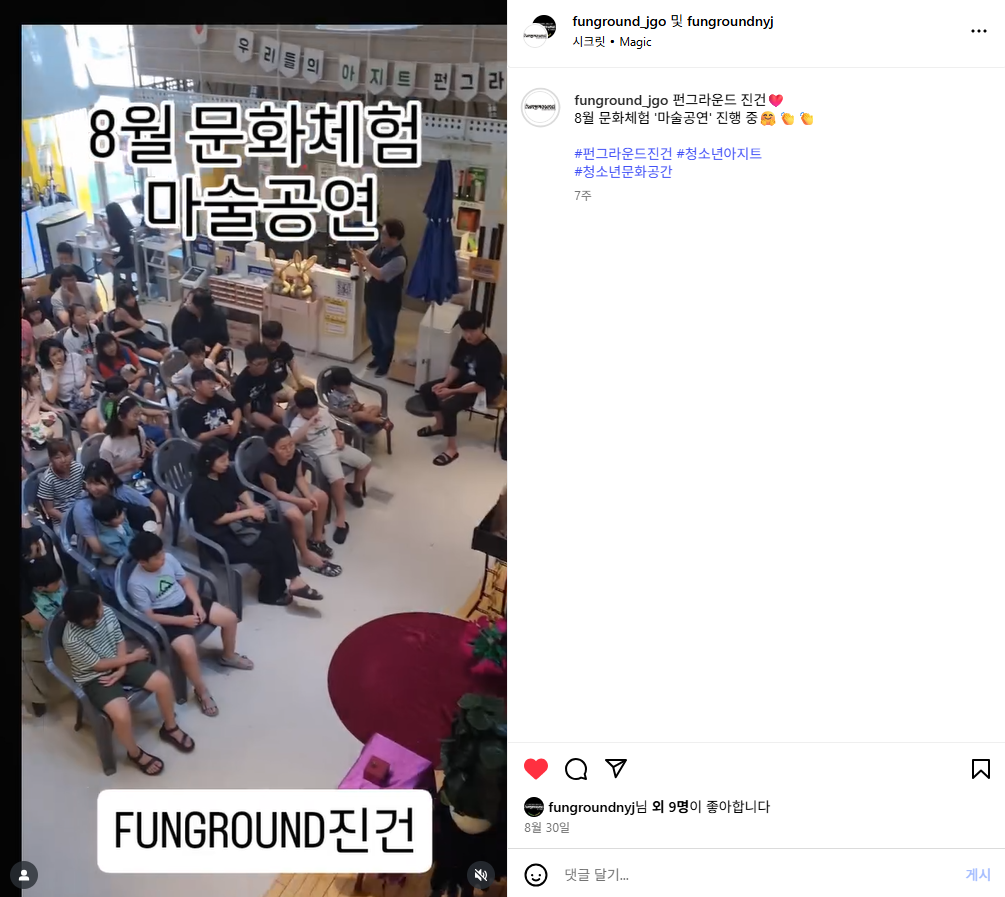 진건 [펀그라운드 진건]문화체험 '마술공연' 작성자 펀그라운드진건 등록일자 2025년 10월 22일 17시 45분 44초 조회 75 스크린샷 2025-10-22 174617.png [ Size : 734.41KB, Down : 29 ] 미리보기 다운로드 목록보기