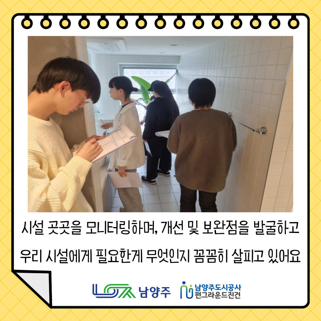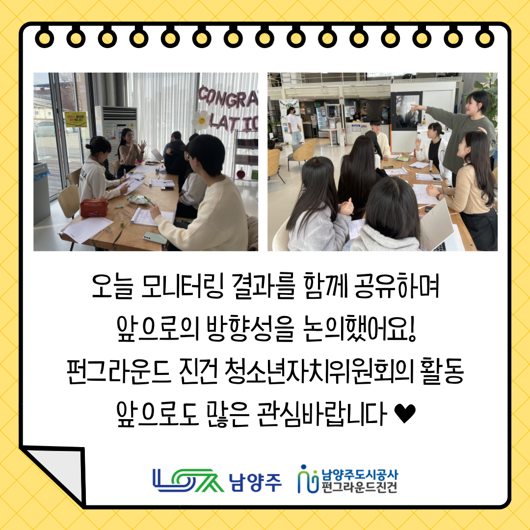 진건 [펀그라운드 진건] 청소년자치위원회 "모니터링" 실시!! 작성자 펀그라운드진접 등록일자 2024년 3월 16일 17시 25분 4초 조회 297 3월 16일 토요일,펀그라운드 진건 청소년자치위원회이 모니터링을 실시했습니다!시설 곳곳을 모니터링하며, 개선 및 보완점을 발굴하고 우리 시설에 필요한게 무엇인지 꼼꼼히 살폈어요!!결과를 공유하는 회의를 진행하며, 앞으로의 방향성을 논의했습니다!!펀그라운드 진건 청소년자치위원회 활동 앞으로도 많은 관심바랍니다문의) 031-560-1381 001 (4).png [ Size : 189.52KB, Down : 120 ] 미리보기 다운로드 002 (4).png [ Size : 240.63KB, Down : 127 ] 미리보기 다운로드 003 (4).png [ Size : 800.46KB, Down : 124 ] 미리보기 다운로드 004 (4).png [ Size : 742.86KB, Down : 134 ] 미리보기 다운로드 목록보기