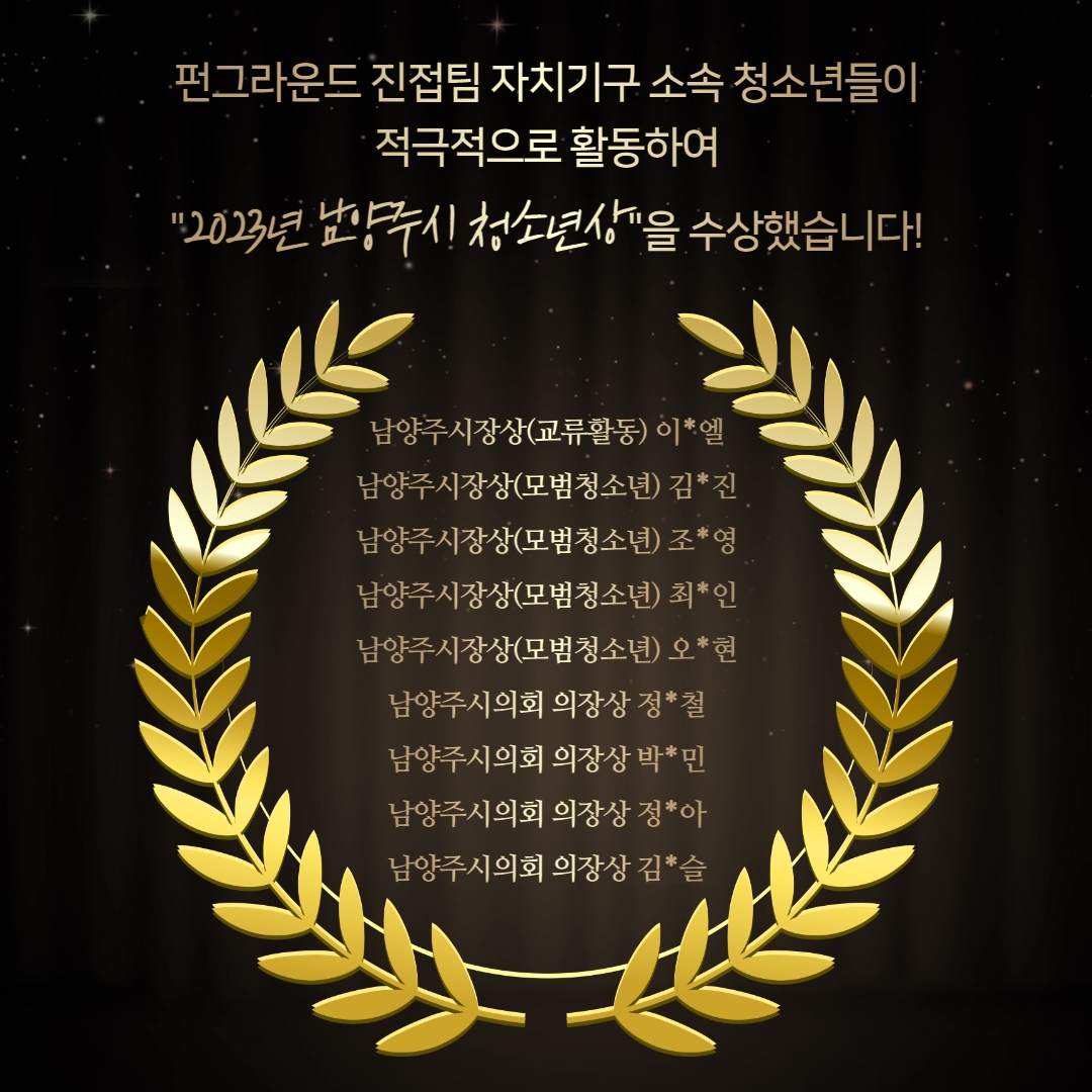퇴계원 [펀그라운드 진접, 진건, 퇴계원] 2023년 남양주시 청소년상 표창! 작성자 펀그라운드진접 등록일자 2023년 6월 15일 9시 41분 46초 조회 460 2023년 남양주시 청소년상 표창!펀그라운드 진접팀(진접, 진건, 퇴계원) 소속 자치기구 청소년들이 뜻 깊은 상을 수상했습니다!다시 한번 축하드립니다:) 청소년의 달 행사 2.jpg [ Size : 542.54KB, Down : 181 ] 미리보기 다운로드 목록보기