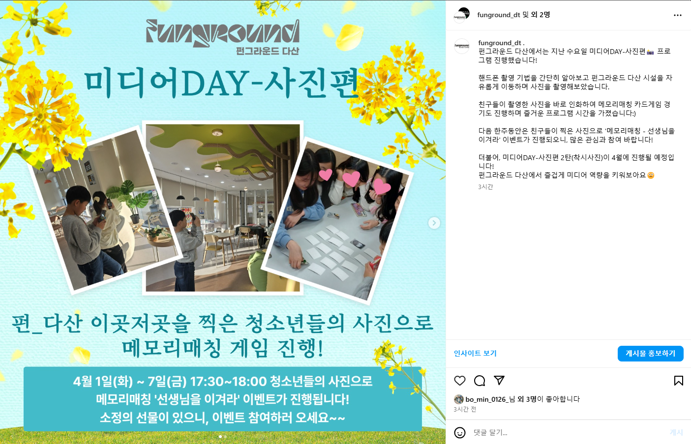 다산 [펀다산] 3월 디지털스튜디오(미디어DAY-사진편) 작성자 펀그라운드다산 등록일자 2025년 3월 27일 20시 2분 6초 조회 233 3월 미디어데이.png [ Size : 1.45MB, Down : 54 ] 미리보기 다운로드 목록보기