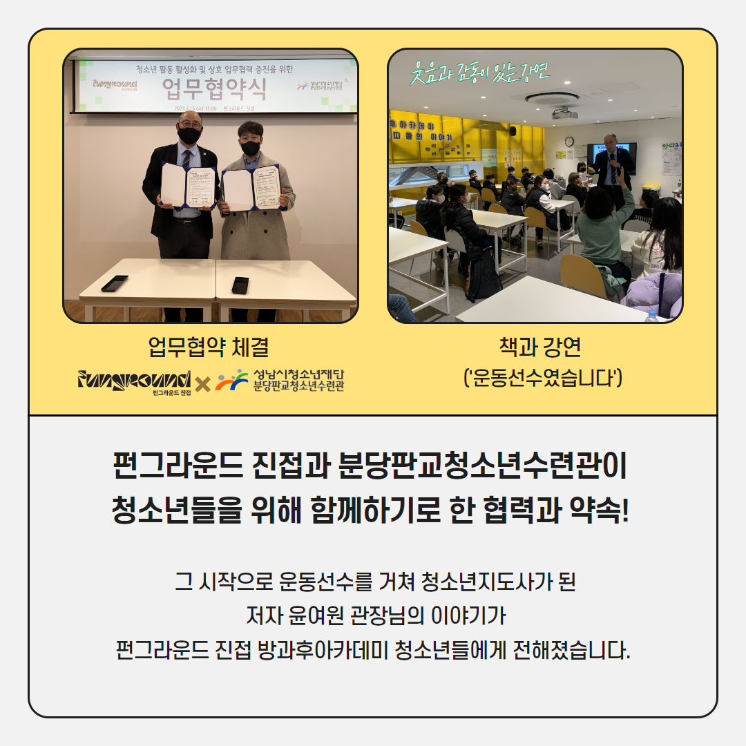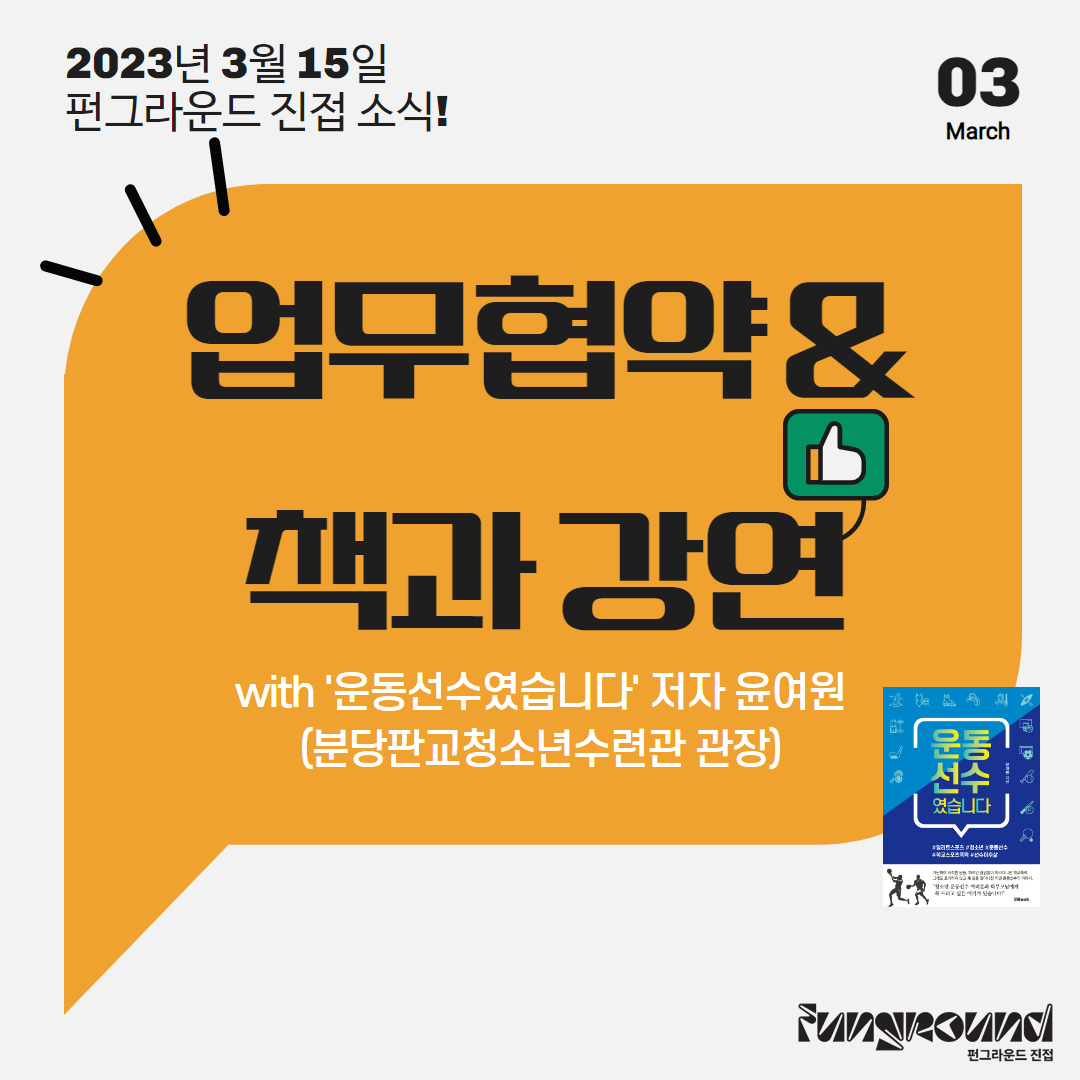 진접 [펀그라운드 진접] 3월 15일 알찬 소식 전해드립니다! 작성자 펀그라운드진접 등록일자 2023년 3월 16일 10시 13분 27초 조회 395 3월15일 펀그라운드 진접에 반가운 작가님이 찾아오셨어요! 본캐는 분당판교청소년수련관 관장님 부캐는 '운동선수였습니다' 저자로 배꼽 빠지는 강연은 기본이고요! 웃음과 감동을 주는 강연자! 윤여원 관장님(작가)과 함께 하였답니다. 청소년을 위해서라면 먼 거리도 마다하지 않는 관장님 덕분에 방과후아카데미 '아띠' 청소년들에 웃음과 감동이 담긴 다양한 이야기가 전해졌답니다. 앞으로 청소년을 위해 뭉친 펀그라운드 진접과 분당판교청소년수련관의 아름다운 이야기 기대해주세요! 제목을 입력하세요 1.png [ Size : 112.89KB, Down : 121 ] 미리보기 다운로드 제목을 입력하세요 2.png [ Size : 657.55KB, Down : 113 ] 미리보기 다운로드 제목을 입력하세요 3.png [ Size : 894.63KB, Down : 119 ] 미리보기 다운로드 목록보기