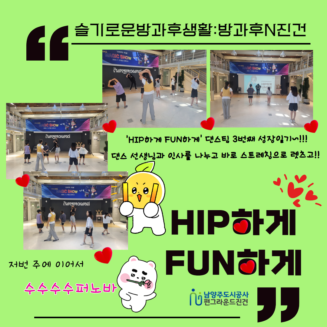 진건 슬기로운방과후생활 HIP하게 FUN하게 성장일기!! 작성자 개발자 등록일자 2024년 8월 9일 14시 32분 34초 조회 225 슬기로운방과후생활:방과후N진건 HIP하게FUN하게 3번째 성장일기!!! 힙하게 펀하게(7.19.).jpg [ Size : 815.58KB, Down : 78 ] 미리보기 다운로드 목록보기