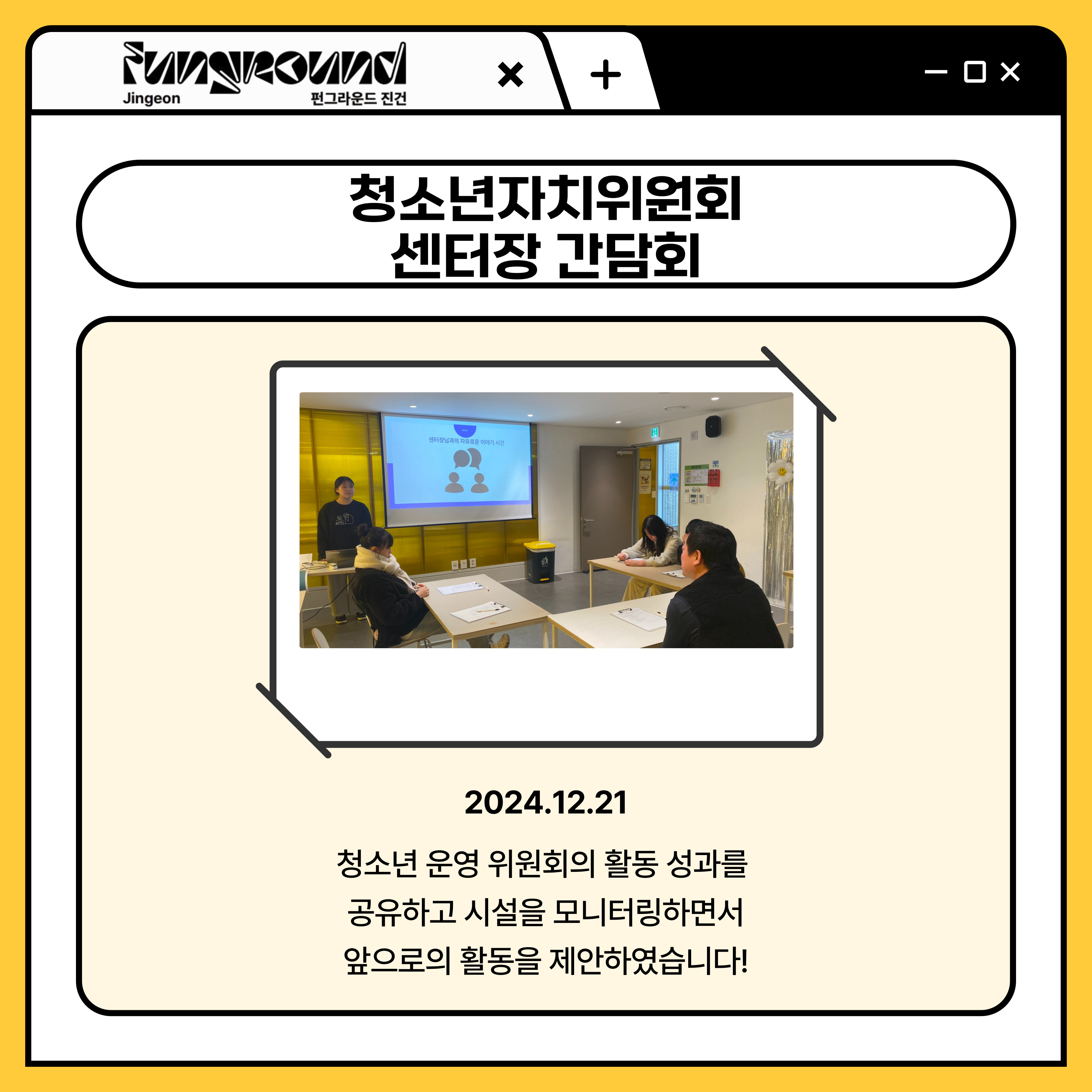 진건 [진건] 청소년자치위원회 센터장 간담회 작성자 펀그라운드진건 등록일자 2025년 1월 9일 14시 7분 48초 조회 273 12월 21일 청소년자치위원회는 센터장 간담회를 통해 센터장님과 이야기하면서 다양한 의견들을 제안할 수 있었습니다~ 간담회-001.jpg [ Size : 790.23KB, Down : 77 ] 미리보기 다운로드 목록보기
