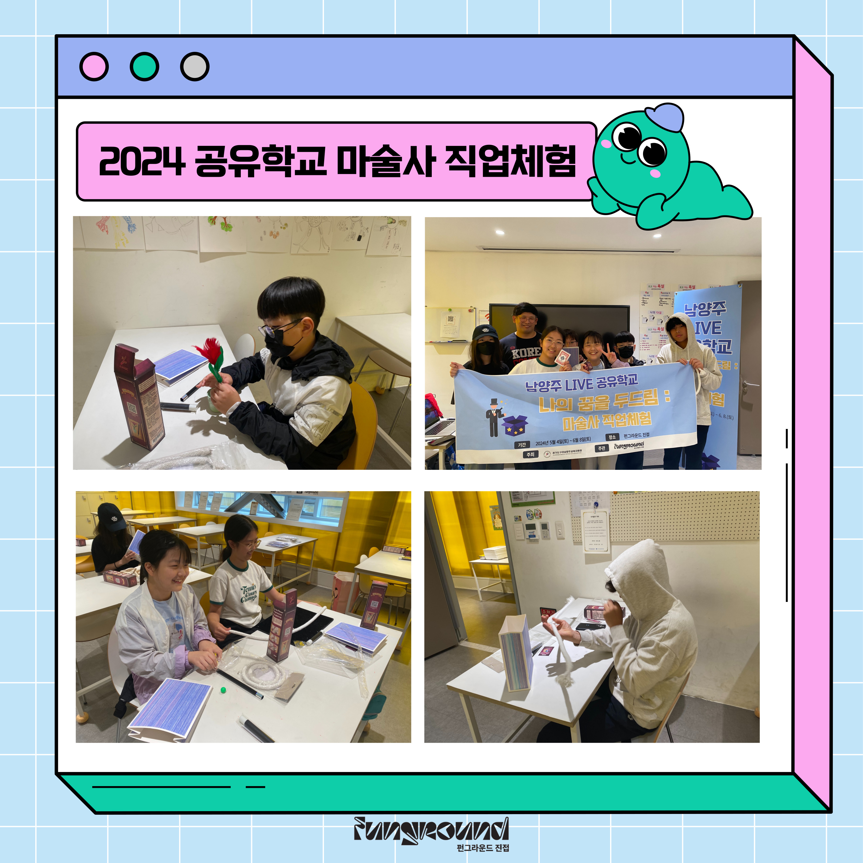 진접 [펀그라운드 진접] 2024 공유학교(진로공유학교-마술사 직업체험) 작성자 펀그라운드진접 등록일자 2024년 6월 8일 17시 34분 41초 조회 263 6월 8일 토요일, "2024 공유학교"를 운영했습니다마술사 키트를 통해 마술사 직업체험을 하는 활동을 진행했습니다문의) 진로공유학교 031-560-1346 제목을-입력해주세요_-001.jpg [ Size : 1.63MB, Down : 87 ] 미리보기 다운로드 목록보기