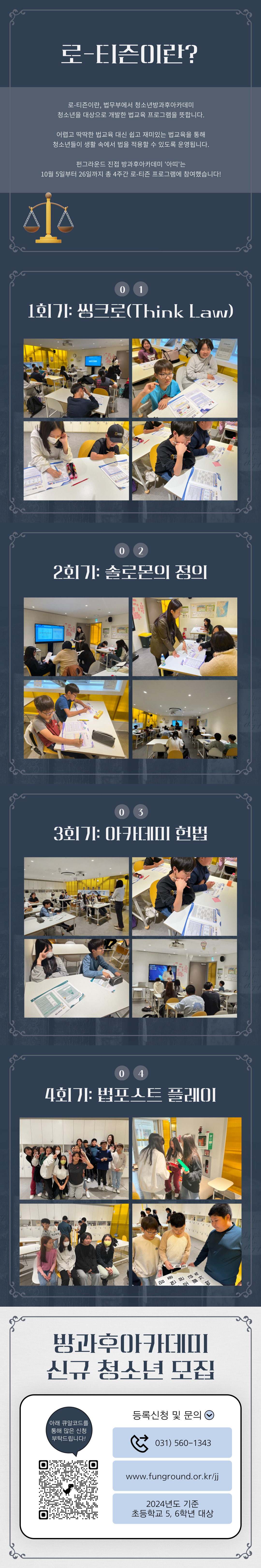 진접 [청소년방과후아카데미] 로티즌 아카데미 작성자 펀그라운드진접 등록일자 2023년 10월 31일 13시 50분 38초 조회 440 청소년방과후아카데미- 로티즌 아카데미아띠는 10월 한 달 동안쉽고 재미있는 법 교육 프로그램로티즌 아카데미에 참여했습니다.요즘 촉법소년 등 사회적 이슈로법에 관심이 많은 청소년들에게좋은 시간이 되었던 것 같습니다:)펀그라운드 진접청소년방과후아카데미에궁금한 점이 있거나,관심이 있으신 분들은언제든지 연락 주세요!TEL. 031-560-1343, 1344 001.jpg [ Size : 140.05KB, Down : 117 ] 미리보기 다운로드 합본.jpg [ Size : 1.41MB, Down : 132 ] 미리보기 다운로드 목록보기