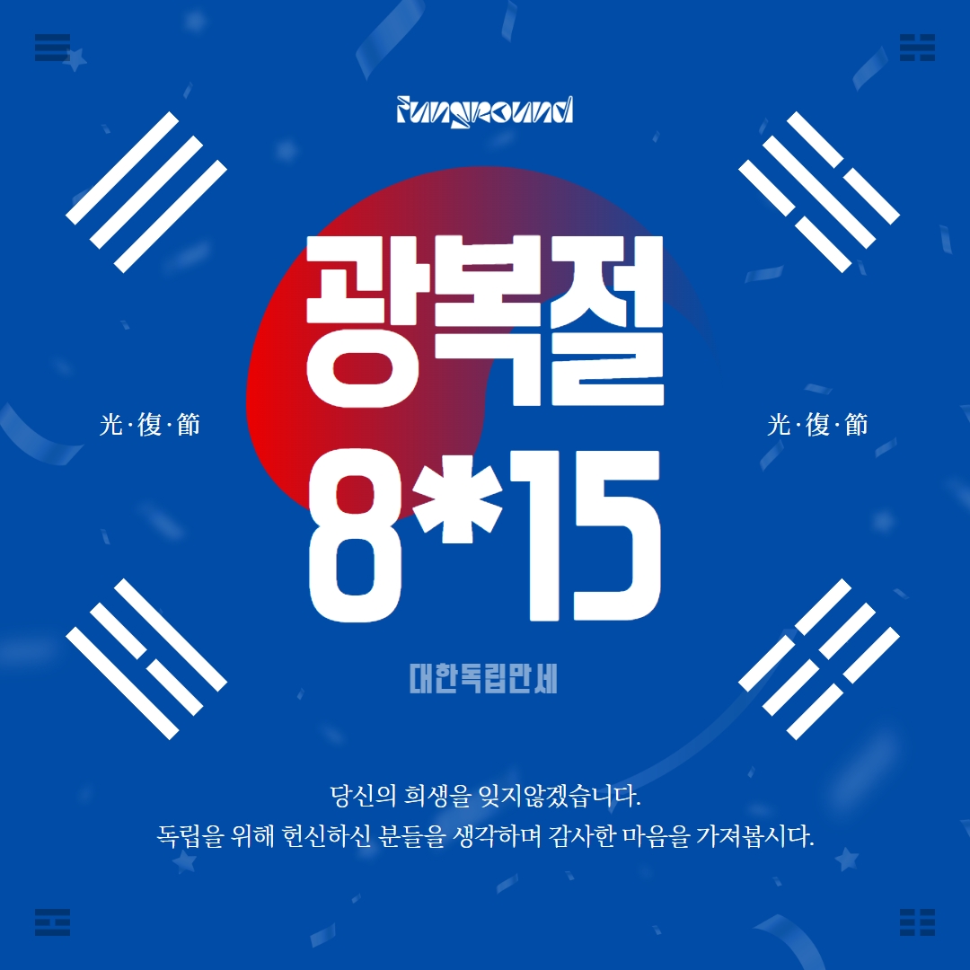 진접 8월 15일 광복절 작성자 펀그라운드진접 등록일자 2023년 8월 13일 21시 33분 29초 조회 379 8월 15일 대한민국의 중요한 날, 광복절입니다.1945년 우리나라가 일본으로부터 해방된 것을 기념하고, 임시정부 법통을 계승한 대한민국 정부수립을 축하하는 날입니다.순국선열의 숭고한 희생과 헌신을 마음 속 깊이 기리며, 잊지 않겠습니다. 제목을 입력하세요.jpg [ Size : 265.85KB, Down : 113 ] 미리보기 다운로드 목록보기