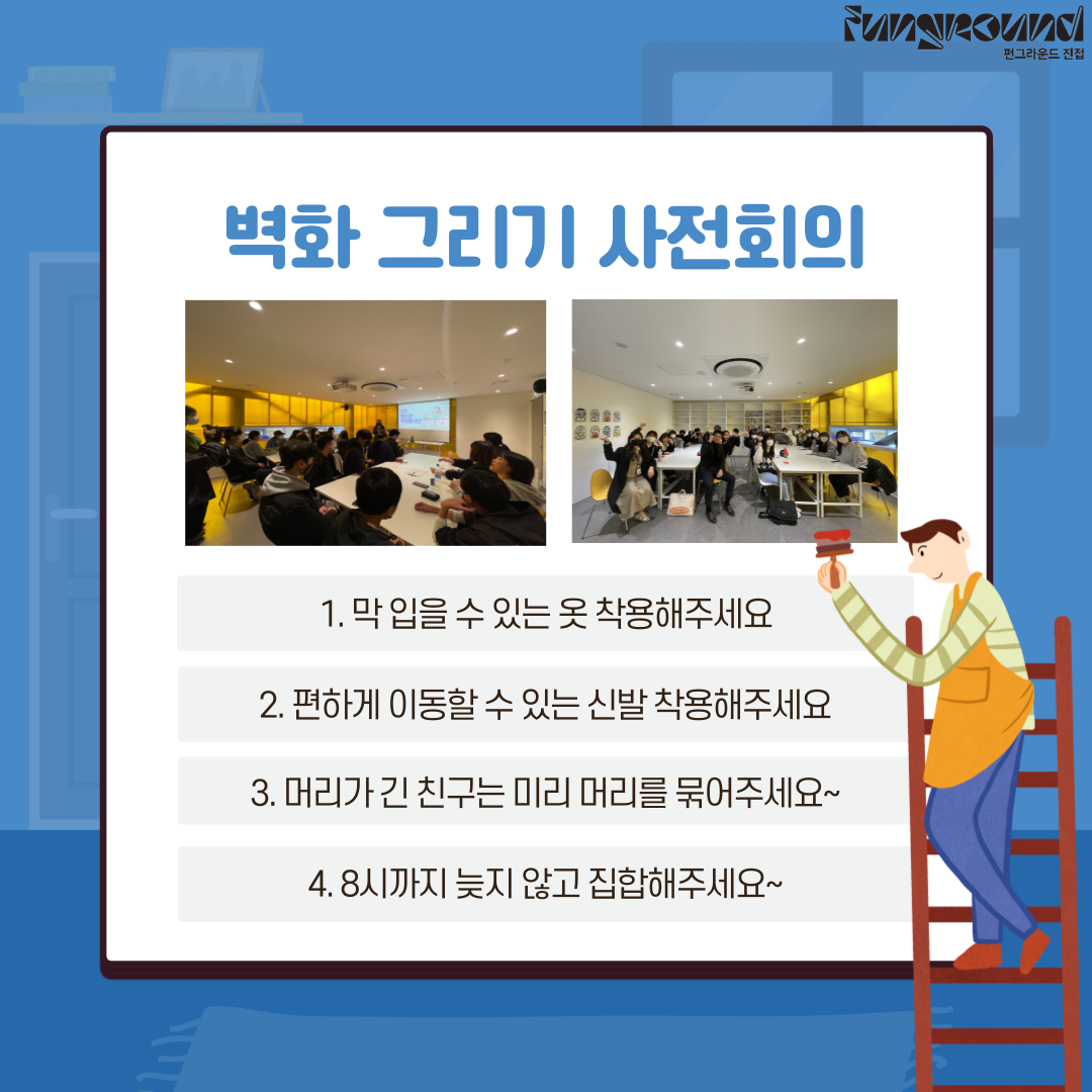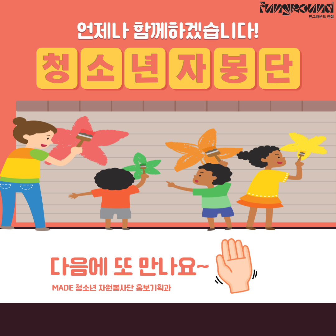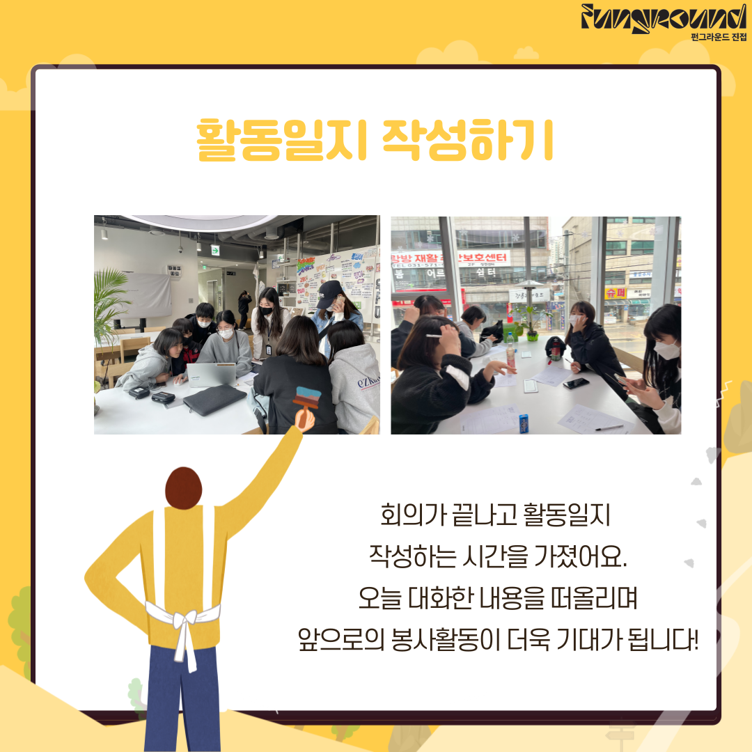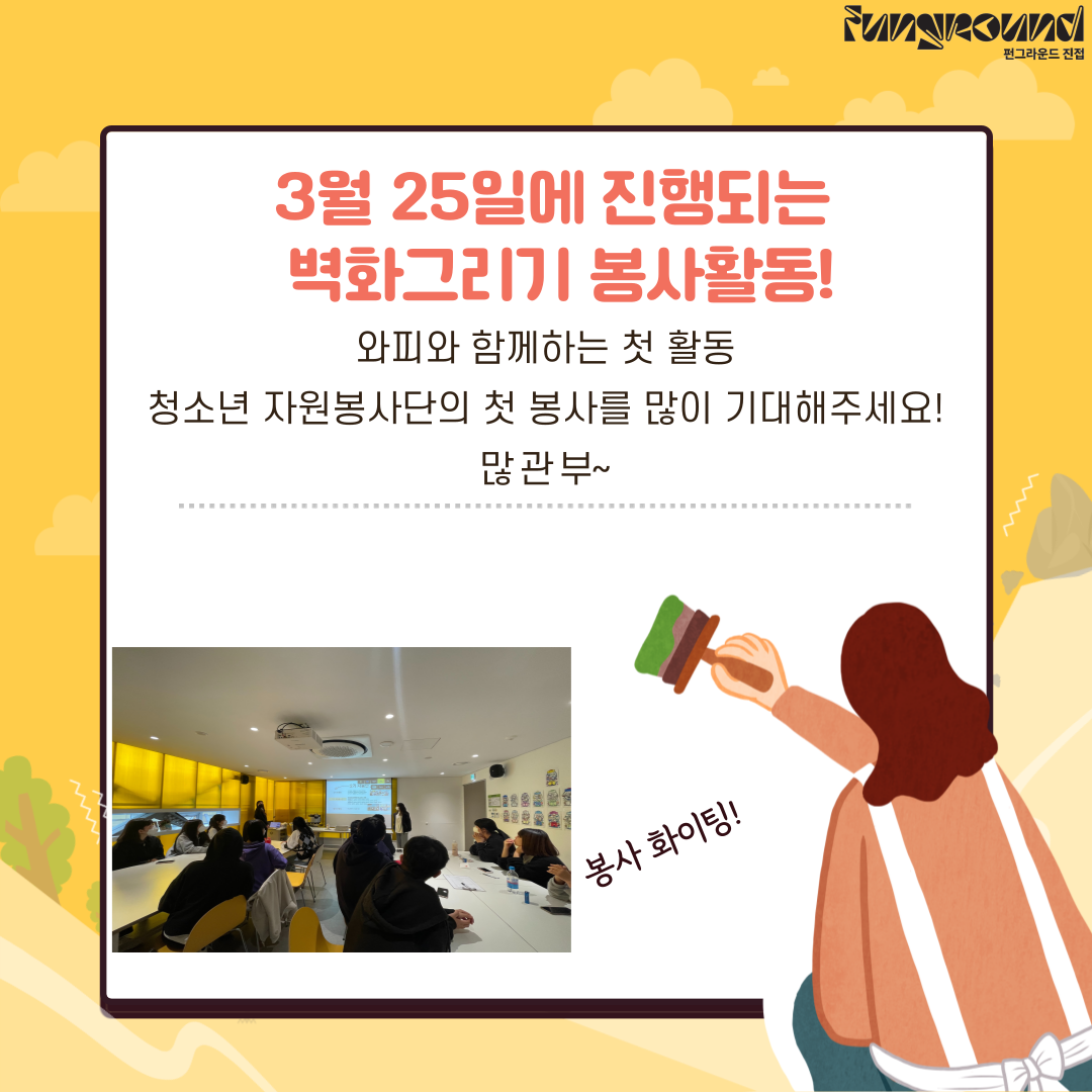진접 [청소년자원봉사단] 교류활동 작성자 펀그라운드진접 등록일자 2023년 3월 11일 17시 9분 52초 조회 467 날씨가 따스한 3월 11일 토요일 오늘!펀그라운드진접의 청소년자원봉사단은 청년봉사단체와의 교류활동 시간을 가졌어요~3월 마지막주 토요일에 청년봉사단체와 함께 벽화봉사활동을 진행하게 되는데요!벽화하기전에 서로 알아가고 준비사항은 뭐가 있는지~ 알아가는 시간이였답니다!앞으로 더더욱 기대되는 자봉단! 많은 관심 부탁드려요! 001.png [ Size : 355.93KB, Down : 114 ] 미리보기 다운로드 002.png [ Size : 298.51KB, Down : 125 ] 미리보기 다운로드 003.png [ Size : 427.31KB, Down : 117 ] 미리보기 다운로드 004.png [ Size : 588.02KB, Down : 135 ] 미리보기 다운로드 005.png [ Size : 421.3KB, Down : 121 ] 미리보기 다운로드 006.png [ Size : 180.85KB, Down : 132 ] 미리보기 다운로드 목록보기