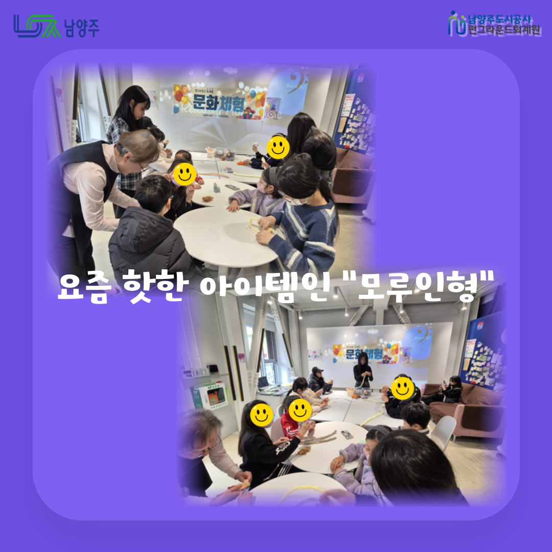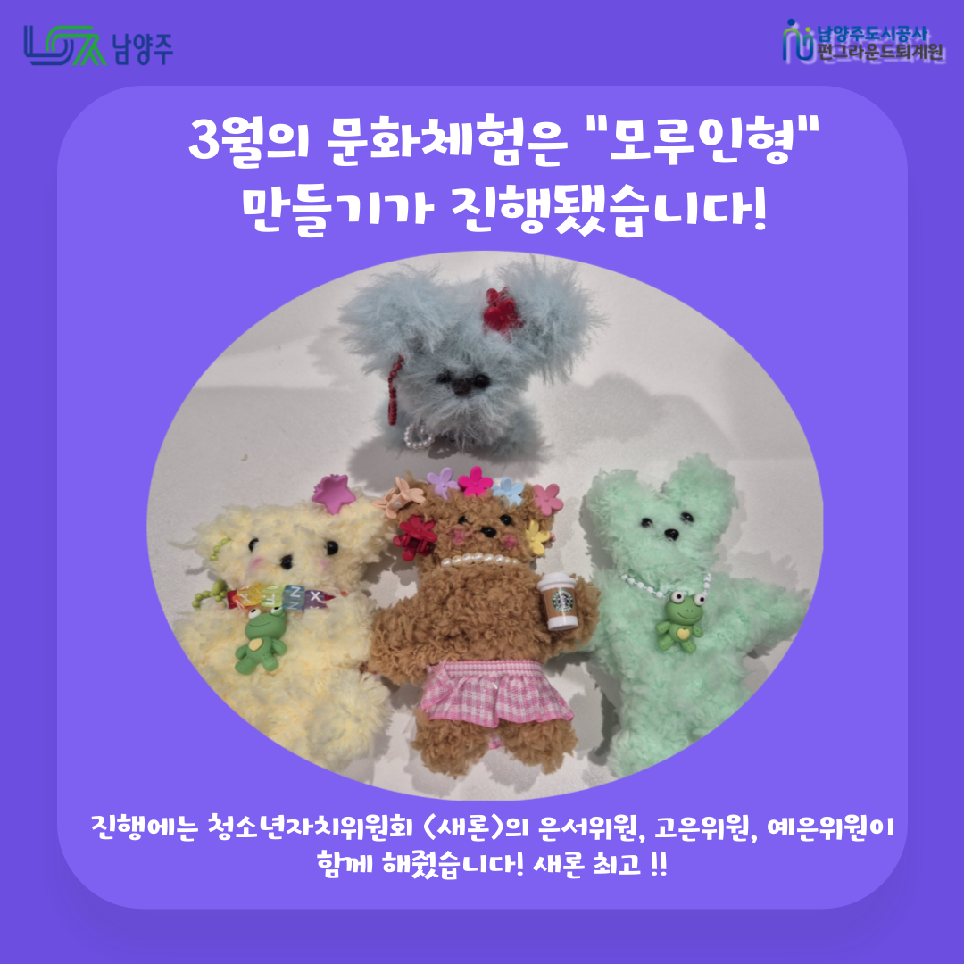 퇴계원 [펀그라운드 퇴계원] 3월 문화체험 작성자 펀그라운드진접 등록일자 2024년 3월 16일 16시 55분 11초 조회 327 3월 16일 토요일,펀그라운드 퇴계원 청소년운영위원회 <새론>을 중심으로 문화체험이 진행됐습니다!이번 3월 문화체험의 주제는 요즘 가장 핫한 "모루인형 만들기"는 청소년자치위원회가 기획하고 운영했는데 아주 인기만점이였다죠오~~스마일 속 가려진 퍼니들의 미소가 계속 생각나는 뿌뜻한 활동이었습니다!Made by 새론 홍보분과 001 (3).png [ Size : 398.97KB, Down : 114 ] 미리보기 다운로드 002 (3).png [ Size : 615.37KB, Down : 110 ] 미리보기 다운로드 003 (3).png [ Size : 887.39KB, Down : 115 ] 미리보기 다운로드 004 (3).png [ Size : 850.01KB, Down : 110 ] 미리보기 다운로드 목록보기