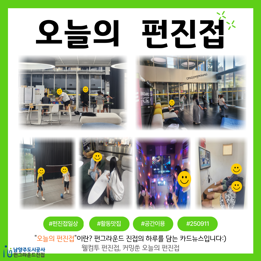 진접 [펀그라운드 진접] 오늘의 펀진접 (9월 11일) 작성자 펀그라운드진접 등록일자 2025년 9월 12일 13시 21분 33초 조회 122 Welcome To 펀그라운드 진접9월 11일 목요일, 오늘의 펀진접은요~?자유롭게 즐기는 → 펀진접누워서 유튜브 보기 딱 좋은 → 펀진접즐거운 노래로 가득한 → 펀진접오늘의 펀진접을 통해 "펀그라운드 진접의 하루"를 만나보아요문의 ☎ 031-560-1386 오늘의 펀진접 카드뉴스.png [ Size : 898.18KB, Down : 47 ] 미리보기 다운로드 목록보기