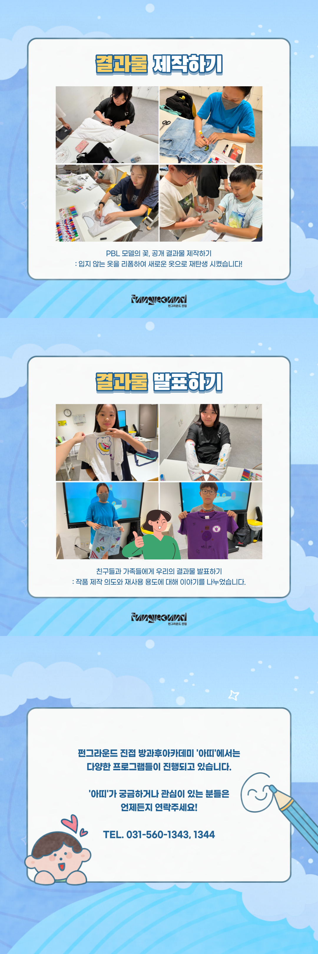 진접 [청소년방과후아카데미] PBL: 디지털 에코 마케터 프로젝트 작성자 펀그라운드진접 등록일자 2023년 8월 28일 14시 41분 31초 조회 437 청소년방과후아카데미- PBL: 디지털 에코 마케터 프로젝트청중에게 공개할 결과물을제작한 후 발표하는 시간을가져보았습니다:)펀그라운드 진접청소년방과후아카데미에궁금한 점이 있거나,관심이 있으신 분들은언제든지 연락 주세요!TEL. 031-560-1343, 1344 001.jpg [ Size : 223.99KB, Down : 118 ] 미리보기 다운로드 제목을-입력해주세요_ (1).jpg [ Size : 695.9KB, Down : 131 ] 미리보기 다운로드 목록보기