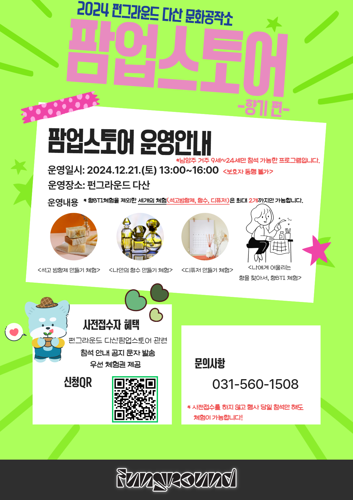 안녕하세요 펀그라운드 다산 입니다! 2024년 12월 21일 토요일 펀그라운드 다산에 "팜.업.스.토.어"가 찾아온다! 12월 문화공작소 "팜업스토어"의 주제는 "향기"입니다! 향과 관련한 체험거리를 제공할 예정인데요. * 석고방향제(왁스타블렛) 만들기 * 나만의 향수 만들기 *디퓨저 만들기 *나만의 향을 찾아서, 향BTI 체험 이렇게 4가지 향과 관련한 활동을 할 예정입니다! 관심있는 청소년들은 아래 링크 혹은 QR코드를 이용해 접수해주세요! *남양주시 거주 9세~24세 청소년만 신청가능합니다! <보호자분들은 출입이 어렵습니다ㅠㅠ> <신청하기> 문의사항 031-560-1508 감사합니다! |