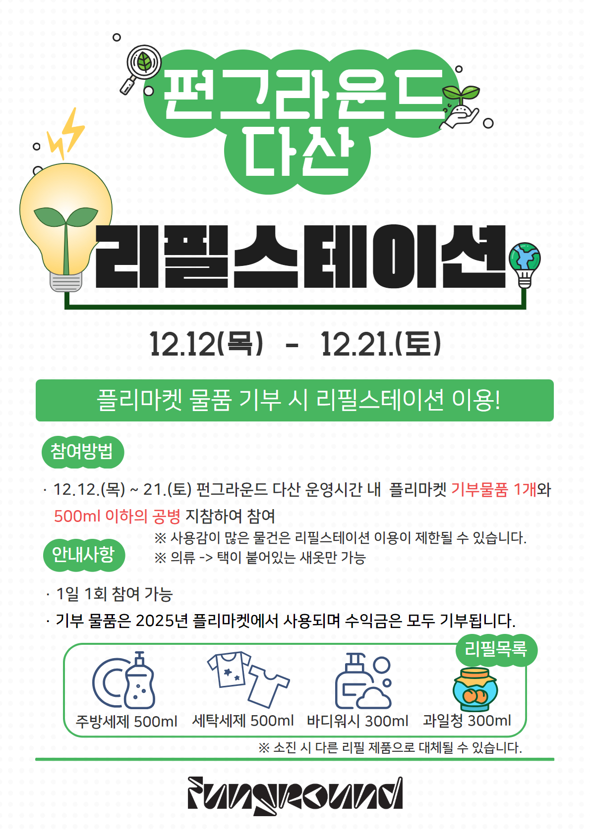 [펀그라운드 다산 12월 리필스테이션 안내] 안녕하세요 펀그라운드 다산입니다:) 펀그라운드 다산은 청소년과 함껨 친환경 펀_다산 만들기를 진행하고 있습니다! 12월 12일(목) ~ 21일(토) 펀그라운드 다산에서 리필스테이션을 진행합니다. 운영시간내에 플리마켓 물품을 기부해주시면 리필스테이션을 이용하실 수 있습니다! 많은 참여와 관심 부탁드립니다! 문의사항 031-560-1507 |