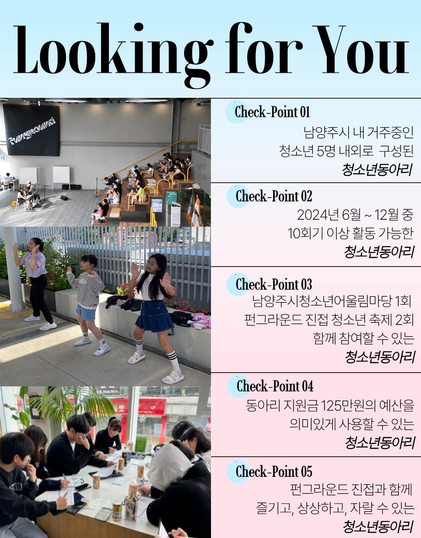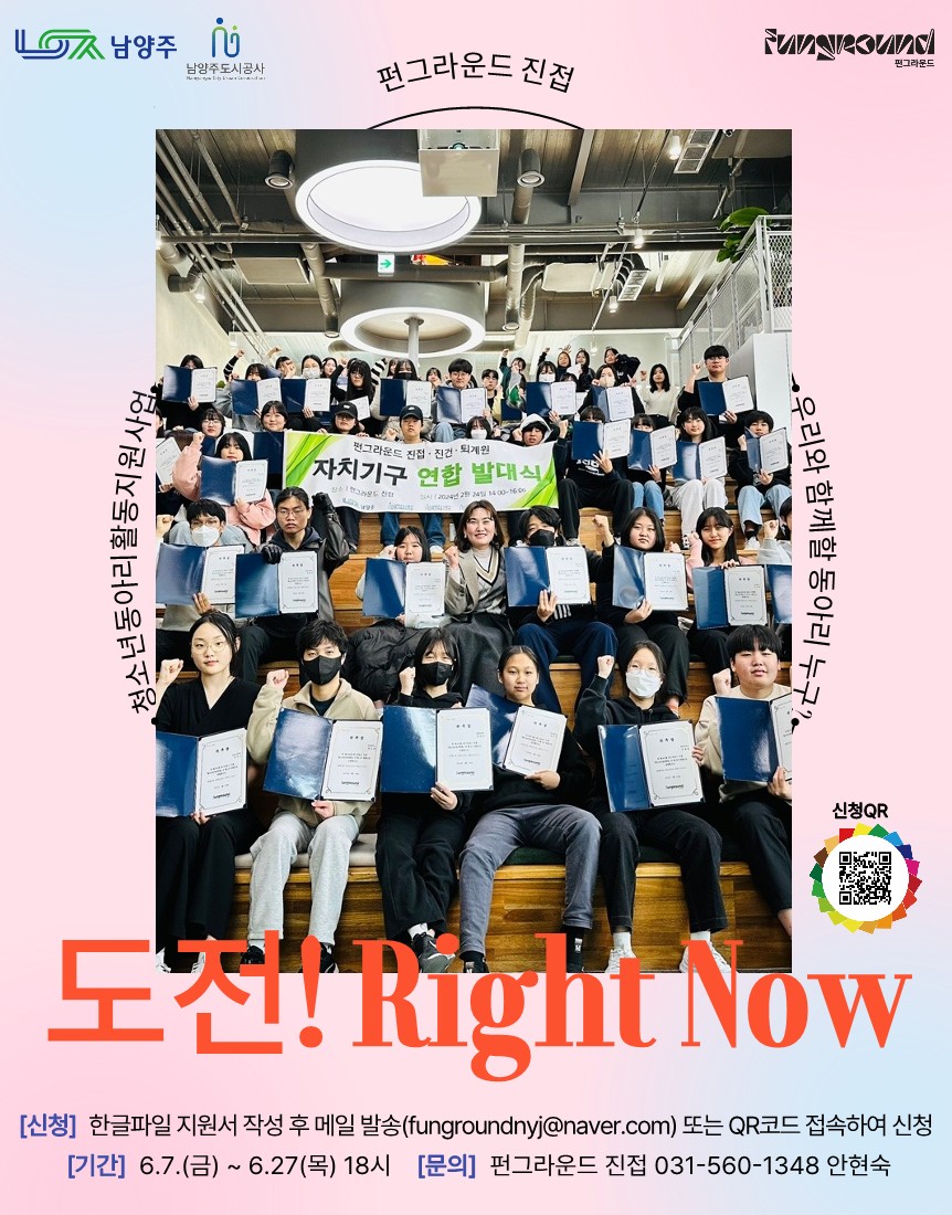 - 사 업 명: 청소년동아리활동지원사업 - 활동내용: 청소년 2개팀 예산 및 활동 지원 등 - 모집대상: 남양주 청소년 5인 이내로 구성된 동아리 2개팀(공연 1개팀, 비공연 1개팀) - 모집일정 : 2024년 6월 7일(금) ~ 27일(목) - 지원자격 ▶남양주시 내 거주 중인 청소년(9~24세) 5명 내외로 구성된 동아리 ▶동아리 담당 지도자가 반드시 포함된 동아리 ※ 담당 지도자 : 법적 보호자(부모, 조부모 등), 멘토 등 동아리 구성원 전체를 대표할 수 있는 성인 ▶연 10회 이상 활동할 수 있는 동아리 ▶남양주시청소년어울림마당 1회 및 펀그라운드 진접 청소년 축제 2회 이상 필수 참여할 수 있는 동아리 ▶동아리 구성 이후 6개월 이상 활동 경력이 있는 동아리 우선 선발 ※ 신규 동아리 선정시 동아리 활성화 취지에 적합하고 연간 활동 계획 및 목표 등이 구체적일 경우 심사위원회의 결정에 따라 지원 가능 ▶펀그라운드 진접 청소년동아리 연합회에 소속되어 함께 활동할 수 있는 동아리 ▶동아리 활동시 펀그라운드 진접 방문하여 활동할 수 있는 동아리 ▶공연동아리 1개팀, 비공연동아리 1개팀 총 2개팀 선발 - 신 청: 포스터 QR코드 접속