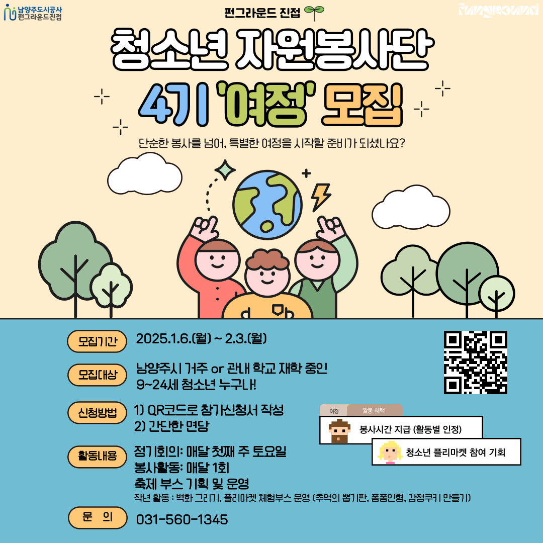 펀그라운드 진접 청소년자원봉사단 4기 모집합니다!! 봉사활동에 관심이 있는 청소년 새로운 봉사활동이 하고 싶은 청소년 재능부자! 열정부자! 청소년 많은 청소년들의 신청을 기다려요~~~ 신청링크 : https://naver.me/FioIm3TI |