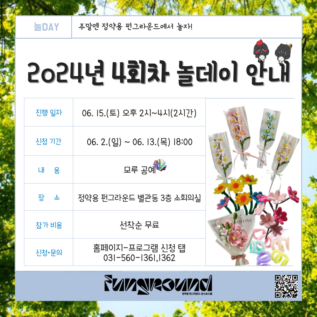 [2024 정약용 펀그라운드 4회차 주말체험프로그램 놀DAY] 모루 공예 1. 일 시: 6. 15.(토) 14:00~16:00 2. 접수기간: 6. 2.(일) ~ 6. 13.(목) 18:00 까지 3. 활동내용: 모루를 이용한 꽃다발 만들기 4. 활동장소: 정약용 펀그라운드 별관동 3층 소회의실(남양주시 조안면 북한강로 881) 5. 참 가 비: 선착순 20명 무료 6. 대 상: 남양주시 초등-중등 청소년(만9세~만16세) 7.문 의: 031-560-1361, 1362 *당일취소 경우 다음 회기 주말체험활동 참여가 어려울 수 있으며, 시설운영에 따라 체험활동이 변경될 수 있습니다.* |