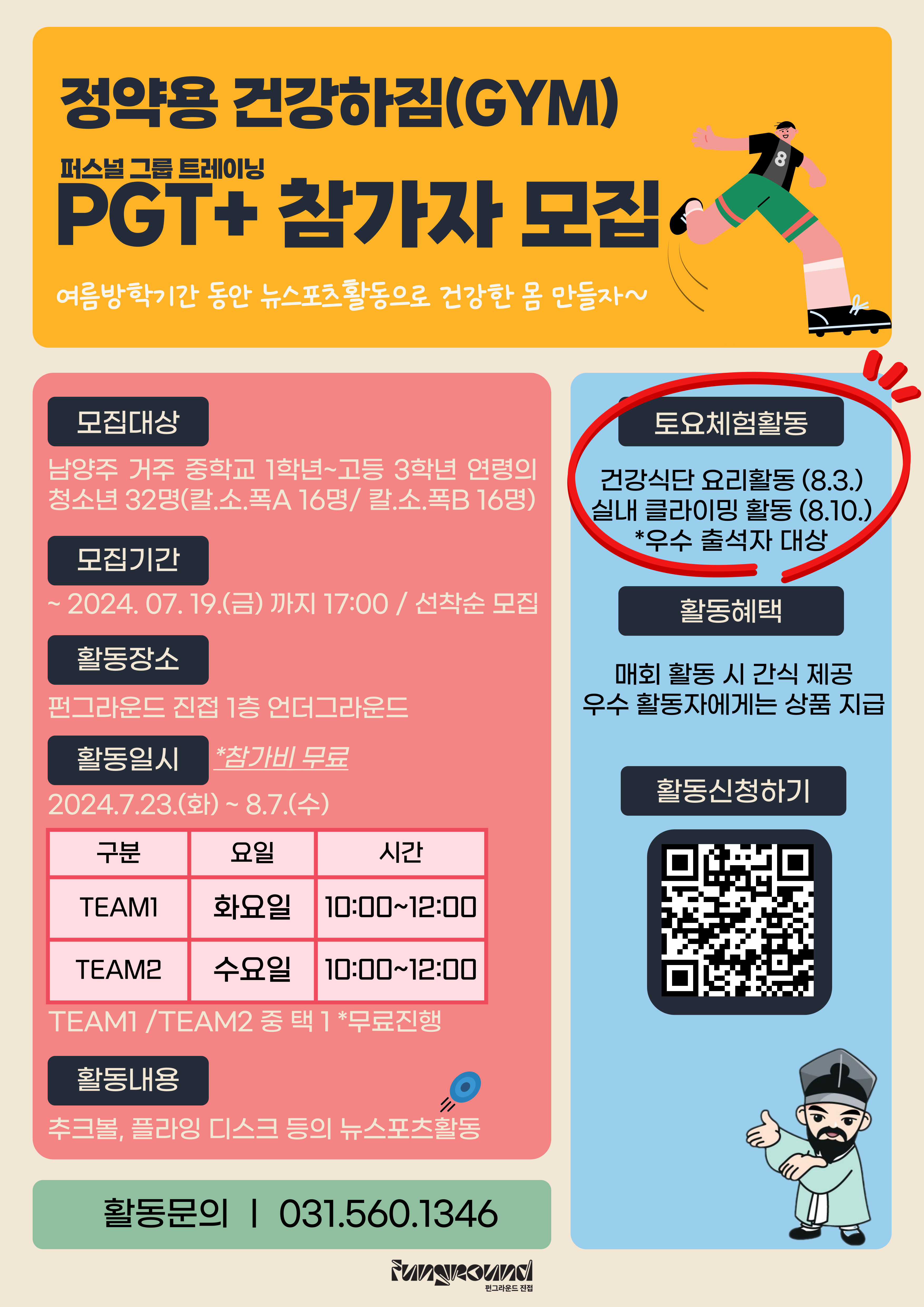 곧 있을 여름방학을 맞이하여 운동프로그램을 준비하였습니다!! 이번 여름방학에는 재미있는 스포츠를 경험하고 싶다면???!!! 정약용 건강하짐(GYM) PGT+입니다 활동기간 : 2024.7.23.(화) ~ 8.7.(수) / 화, 수요일 진행 활동장소 : 펀그라운드 진접 1층 참가인원 : 남양주 거주 중학교 1학년~고등 3학년 연령의 청소년 32명(TEAM1 16명/ TEAM2 16명) 활동내용 - 뉴스포츠 활동 / 토요체험활동 : 실내클라이밍, 요리활동 참가방법 : QR코드 인식 후 신청서 작성 ↑↑신청하기 참 가 비 : 무료 |