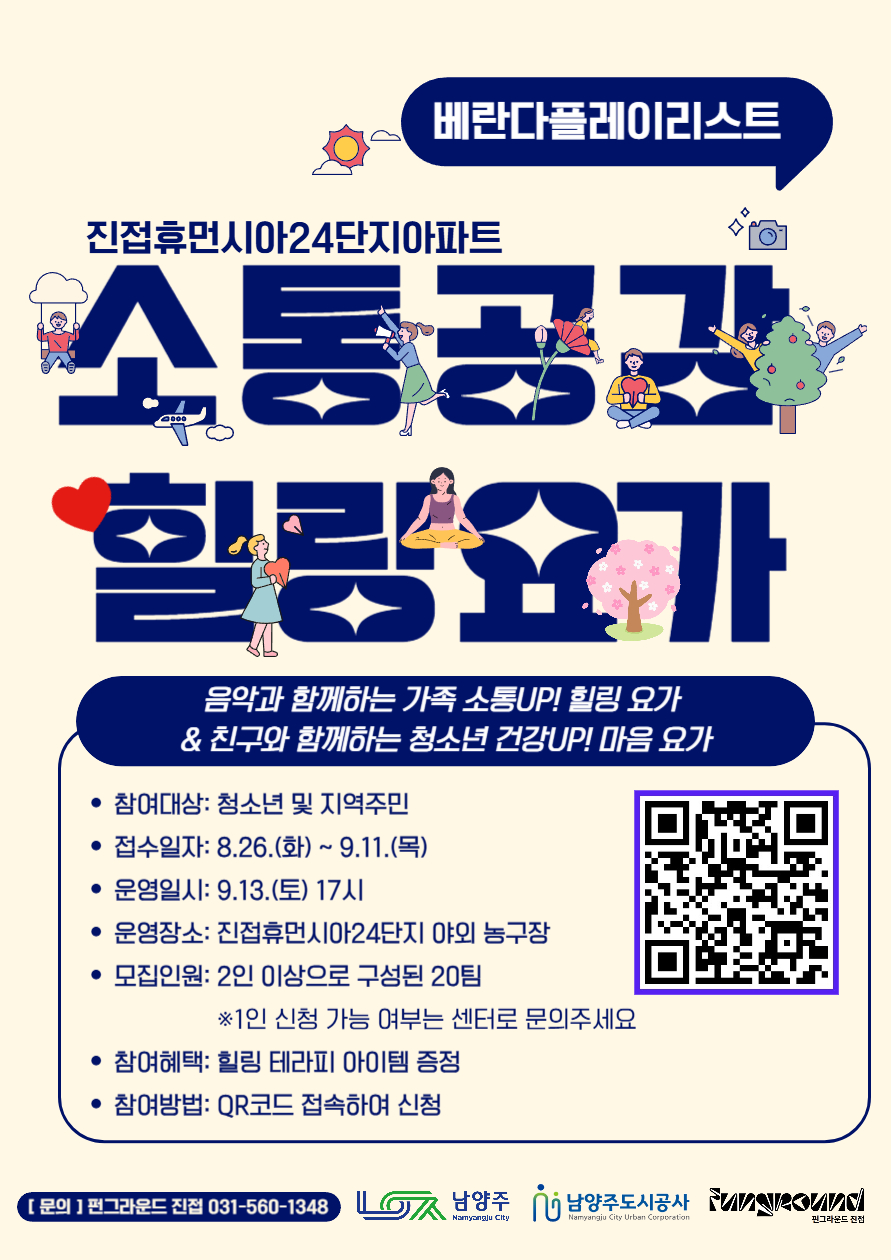 ♥펀그라운드 진접 '베란다플레이리스트' 클래식 요가 참가자 모집♥ - 일시: 9. 13.(토) 17:00~17:40 - 대상: 2인 이상으로 구성된 20개팀(청소년, 학부모 모두 참여 가능) / 대기 10팀 - 장소: 진접휴먼시아24단지아파트 야외농구장(진접읍 해밀예당1로 295) - 신청: https://naver.me/xVGBXYGq - 혜택: 힐링테라피 아이템 증정 - 문의: 펀그라운드진접 031-560-1348 #남양주도시공사 #펀그라운드진접 #청소년활동 #참가자모집 #많은관심과참여부탁드립니다 |