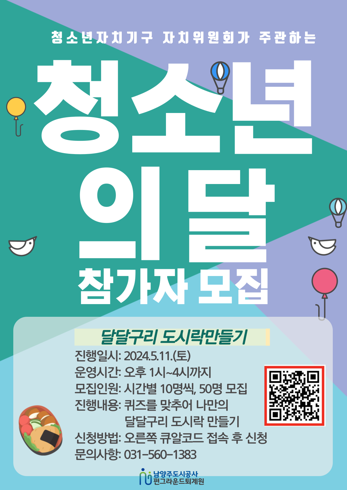 5월 청소년의 달 축제 달달구리 도시락 만들기 참가자 모집 일시: 5월 11일(토) 오후 1시~오후 1시 30분 오후 1시 30분~ 오후 2시 오후 2시 ~ 오후 2시 30분 오후 2시 30분 ~ 오후 3시 오후 3시 ~ 오후 3시 30분 타임별 10명 모집 내용: 퍼니가 준비한 퀴즈를 맞추어 나만의 달달구리 도시락 만들기 진행장소: 펀그라운드 퇴계원 문의사항: 031-560-1382 ● 신청링크: https://naver.me/xvtrgSvy |