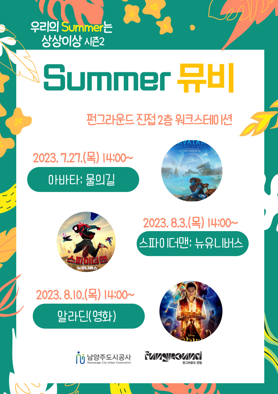 2023년 하계방학을 맞이하여 펀그라운드 진접에서 썸머 뮤비를 진행합니다! 사전접수 및 현장접수로 진행하며, 영화상영 20분 전 도착하여 신청해 주시면 됩니다. |