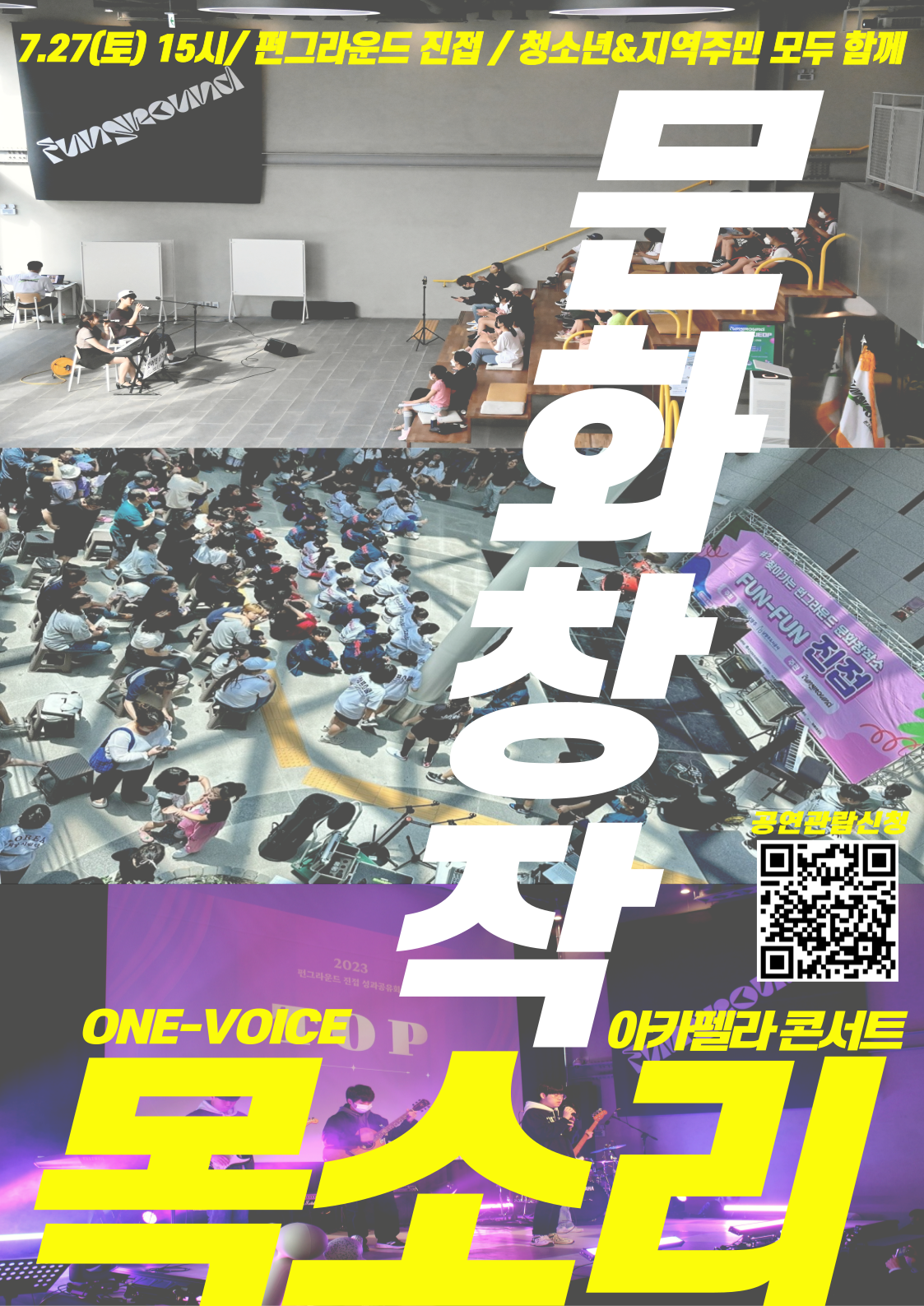 - 사 업 명: 문화창작소 7월 'ONE-VOICE 아카펠라 콘서트' - 일시 : 2024년 7월 27일 (토) 15:00~16:30 - 장 소 : 펀그라운드 진접 - 대 상 : 남양주시 청소년 및 지역주민 - 주 최 : 남양주시청, 남양주도시공사 - 주 관 : 펀그라운드 진접(진건/퇴계원) - 내 용 : 청소년 및 지역주민과 함께하는 아카펠라 콘서트 - 신 청 : 아래 포스터 QR코드 또는 신청 URL접속하여 신청 [URL] https://forms.gle/WVzhDAChs4JowuSt8 ※ 개별 또는 단체(가족, 친구 등)로 신청 가능합니다. ※ 본 공연은 청소년과 지역 주민이 함께하는 문화 공연 콘서트입니다. 청소년과 함께하는 성인(부모님, 조부모님 등)도 콘서트 참여 신청이 가능합니다. 단, 신청 그룹에 청소년이 없을 경우 신청 불가 합니다. ※ 공연 관람을 위한 자리 배정은 온라인 신청 접수 순서로 배정되며 무대 맨 앞 자리부터 순차적으로 배정됩니다. |
