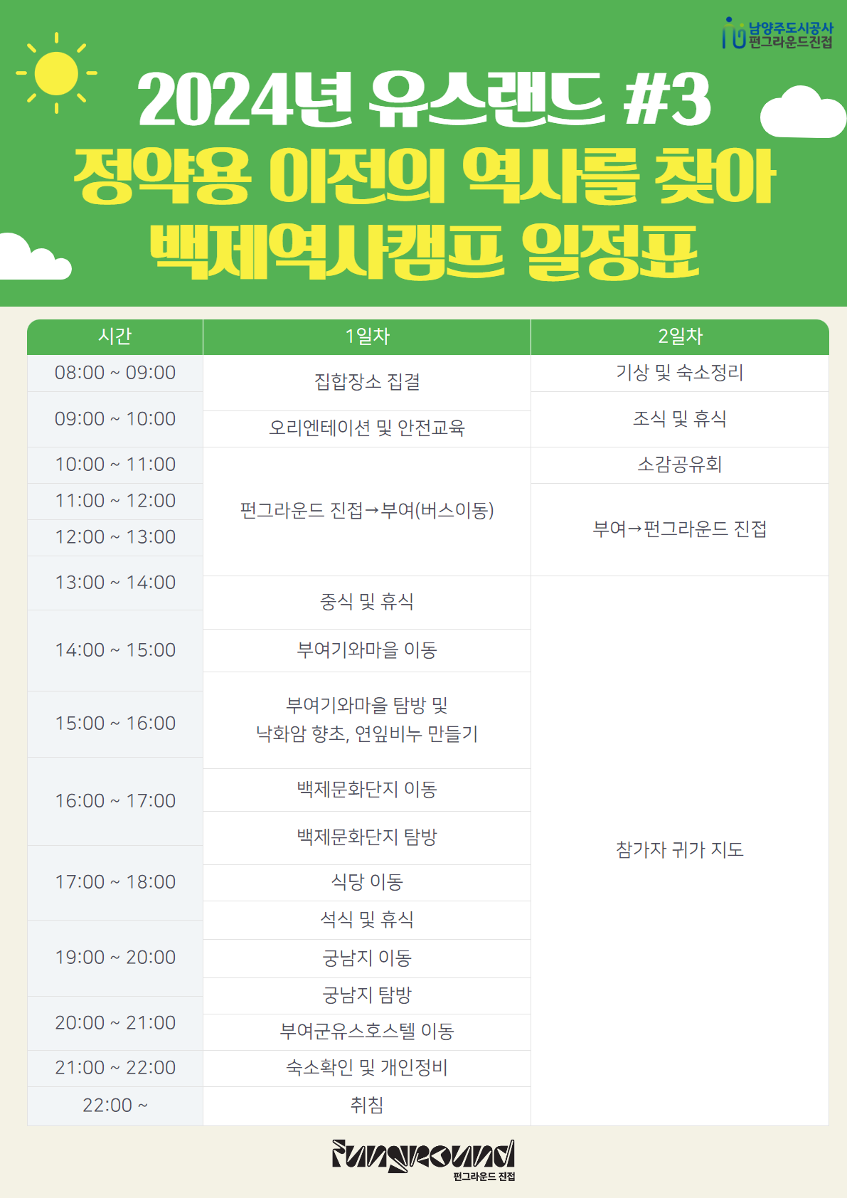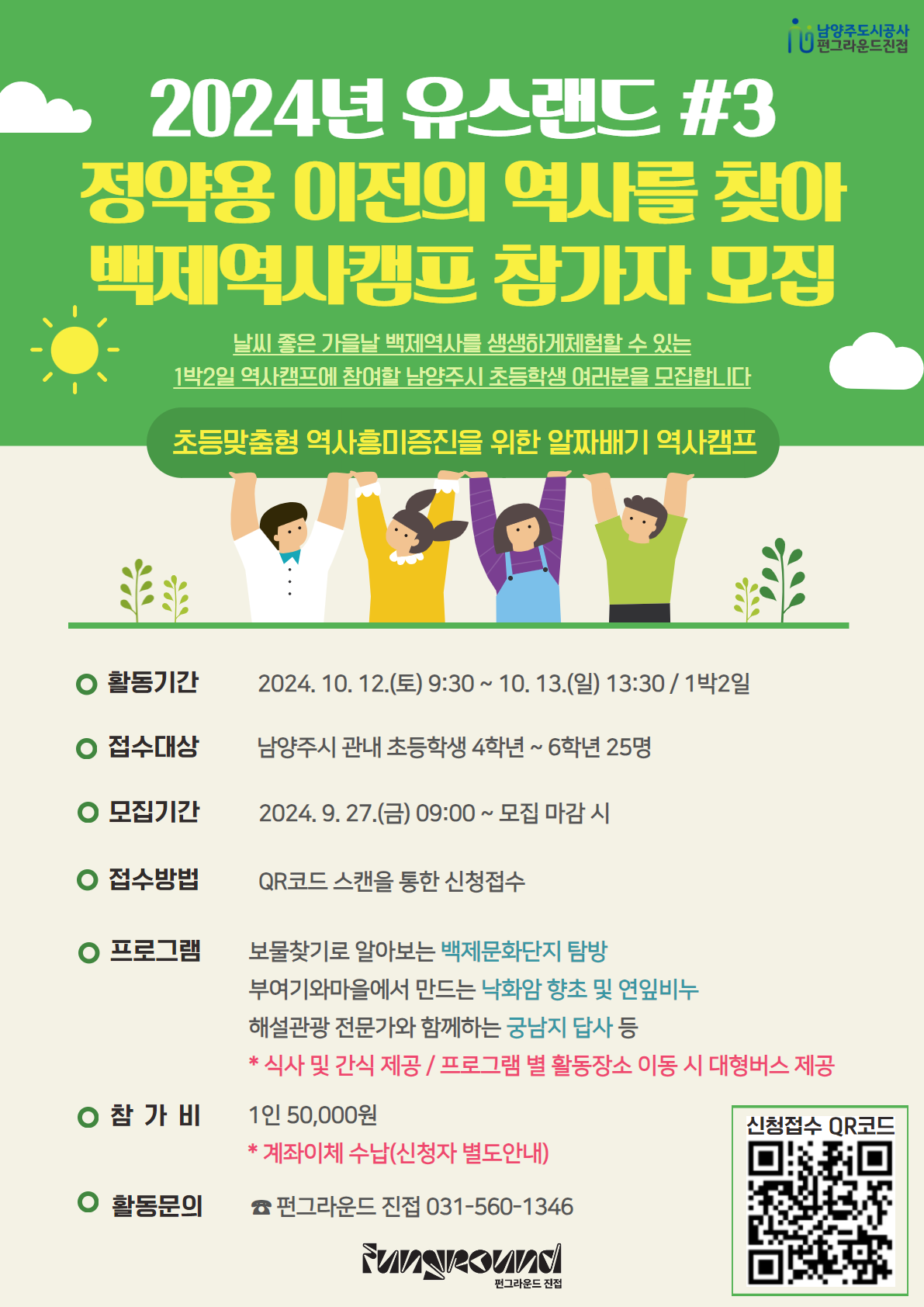 [2024년 유스랜드 #3 정약용 이전의 역사를 찾아 백제역사캠프 참가자 모집] 남양주시 관내 초등학생 4학년~6학년 참가자 분들의 많은 신청바랍니다 - 활동일시 : 2024.10.12.(토) 09:30 ~ 13.(일) 13:30 / 1박2일 - 활동장소 : 백제문화단지, 궁남지, 부여기와마을, 부여군유스호스텔 - 참가인원 : 남양주시 거주 초등학교 4학년~ 6학년 청소년 25명 - 활동내용 * 백제문화단지 및 궁남지 탐방 * 부여기와마을에서 만드는 낙화암 향초 밀 연잎비누 - 참 가 비 : 1인당 50,000원(계좌이체만 가능) - 결제기간 : 신청자 별도안내 - 활동문의 : 031-560-1346 - 참여하기: https://naver.me/53lGgbX1 |
