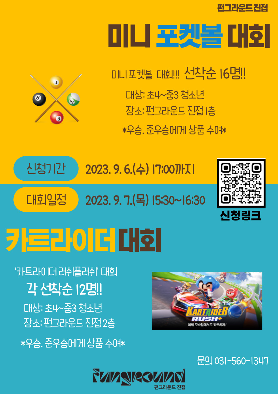 2023년 카트라이더 러쉬플러쉬 대회 운영 9.7.(목) 16:00~17:00 2층 워크스테이션 우승, 준우승에게는 소소한 상품이 있습니다. |